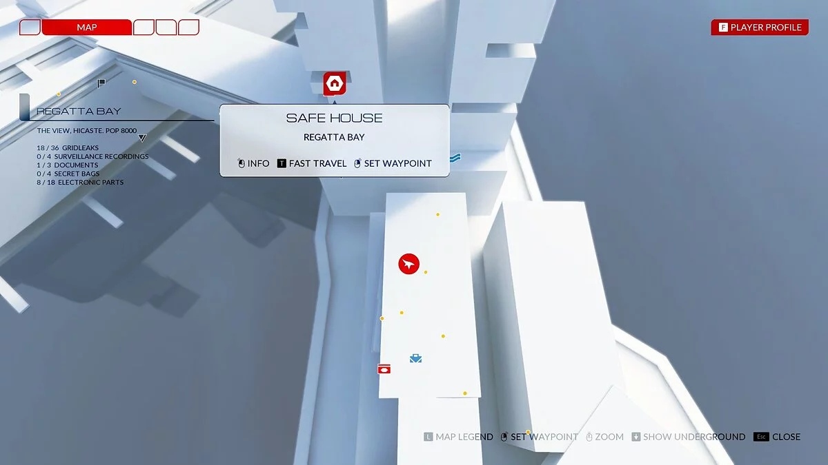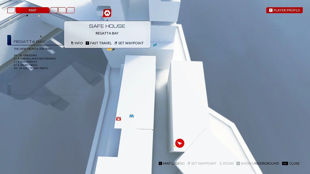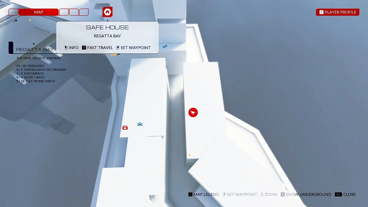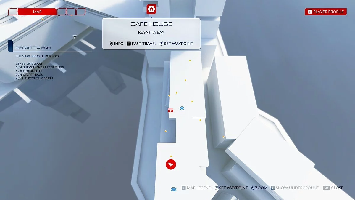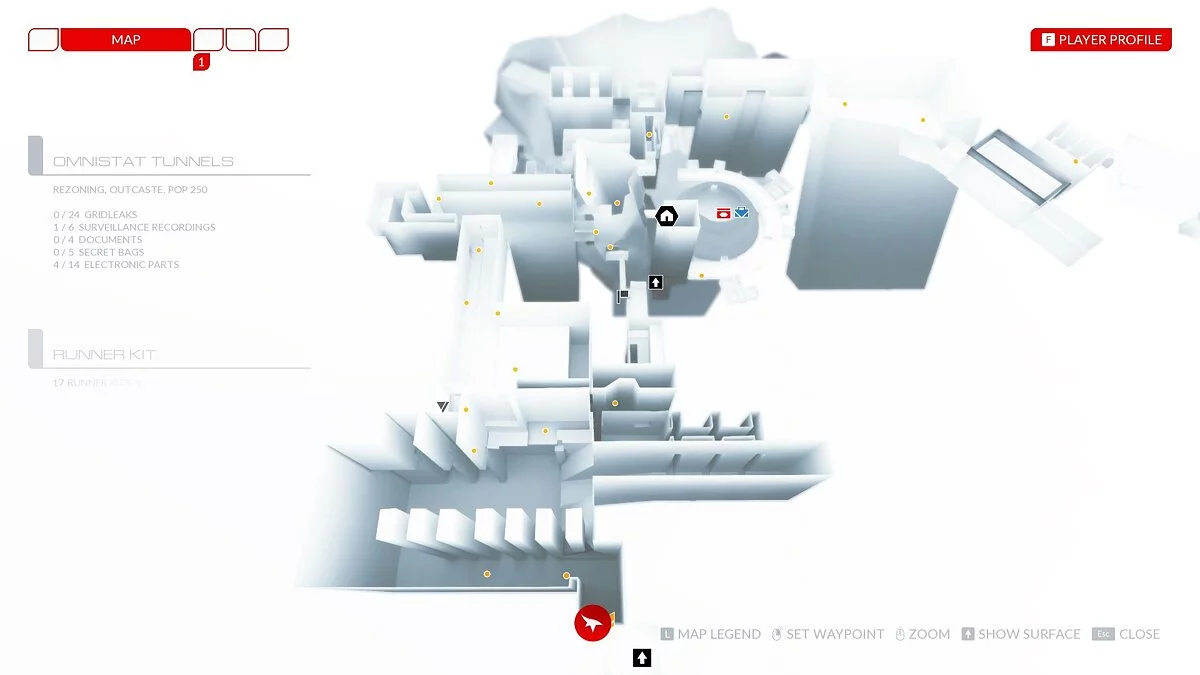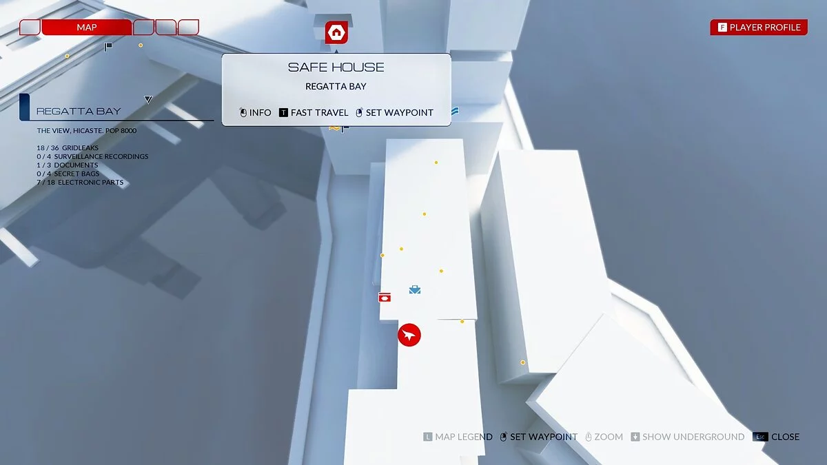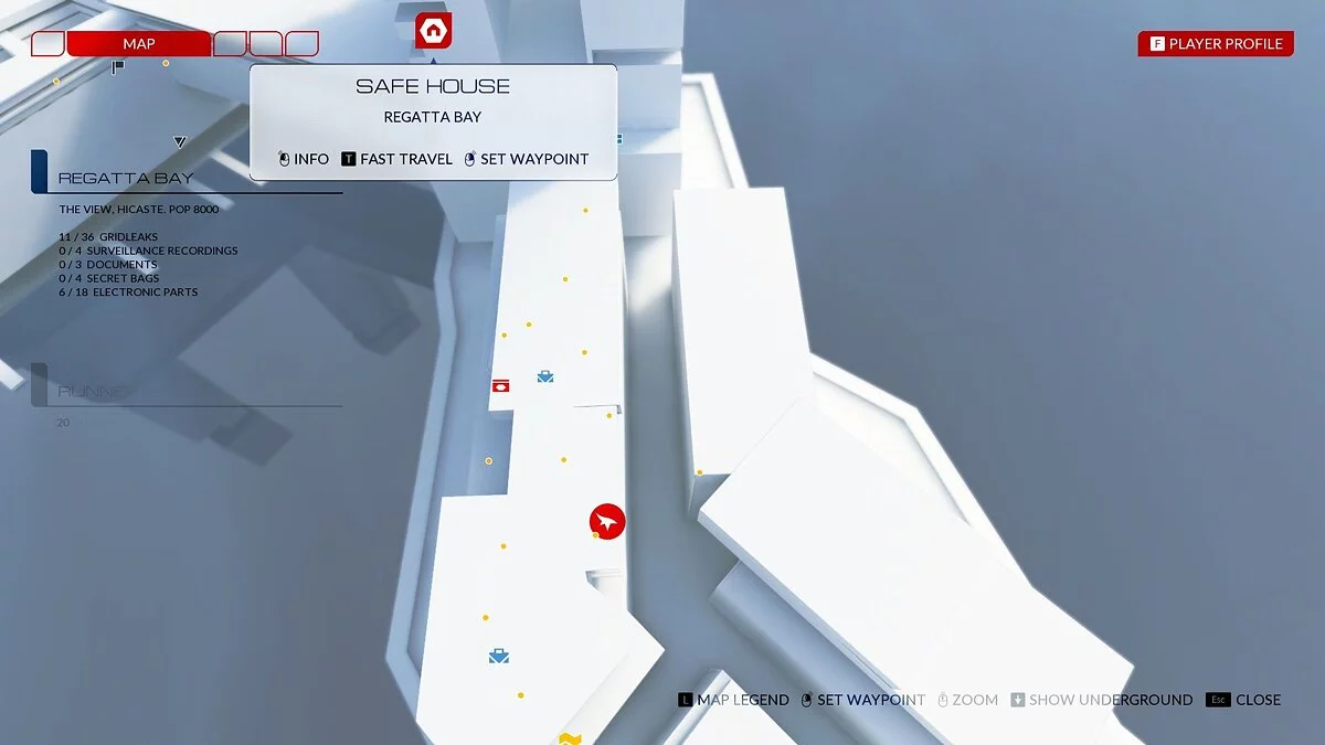 Имейте в виду, что некоторые документы, аудиозаписи и секретные сумки можно собрать, только внутри определенной сюжетной миссии. Вы можете проверить количество собираемых предметов в каждой миссии, открыв вкладку ЗАДАНИЕ в меню Mirror's Edge Catalyst. Не волнуйтесь, если что-то пропустите, так как каждую миссию можно перепройти, собрав все нужные для 100-процентного прохождения компоненты.