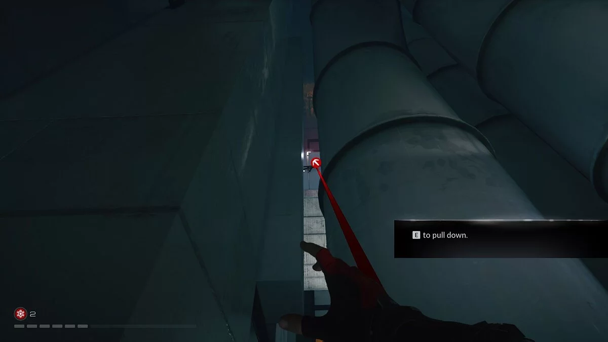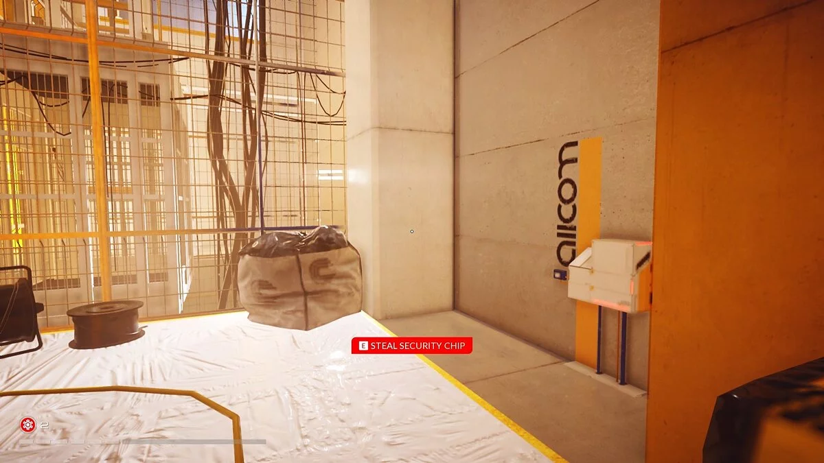 Опуститесь до нижних помостов и найдите помост, находящийся выше всех, который ведет в ЗОНУ ЗАСТРОЙКИ. Используя крюк-кошку, стяните панели, а затем поднимитесь наверх. Отсюда, используя навыки бега по стенам и разворота на 180 градусов, доберитесь до места повыше. Сумка ждет вас на помосте.