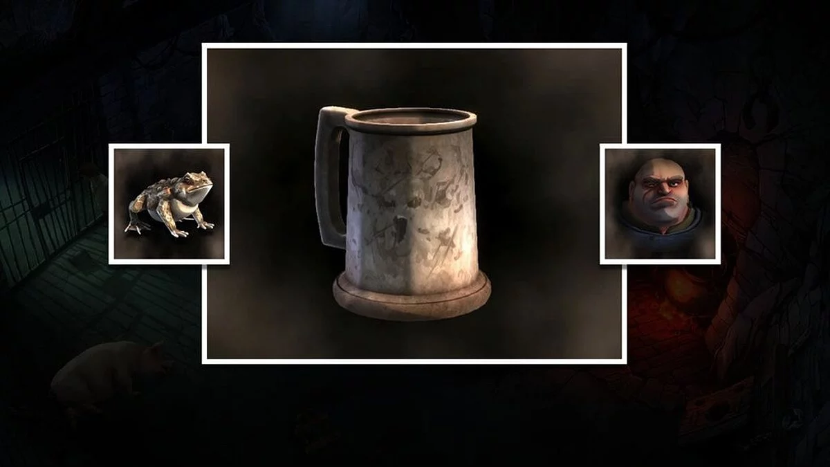 Берём лезвие меча у столба рядом с котлом и раскаляем его на огне под котлом. Горячим лезвием меча тыкаем свинью в бок. Боров кричи от боли, а охранник, взбешённый его визгом, бросает в камеру свою кружку. Взять её нельзя, но можно подменить на отравленную, предварительно смазанную ядовитыми железам лягушки. Охранник забирает кружку, пьёт из него, и ему видится дьявол.