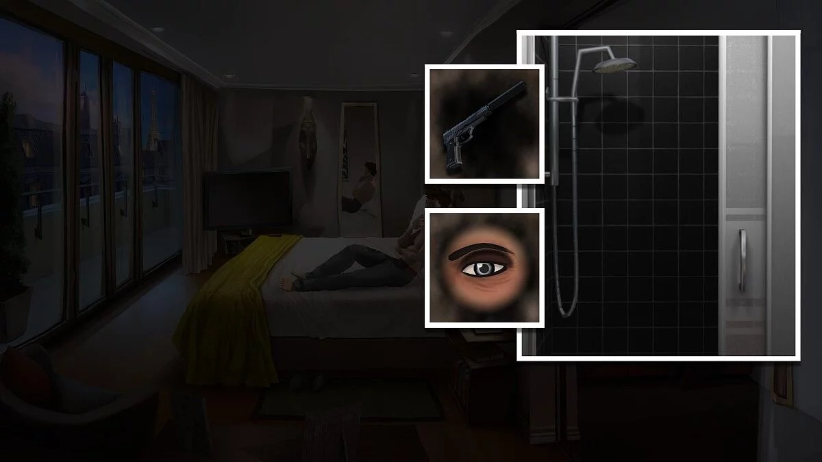 Затем в комнате появляется Паулина, управление переходит к ней. Смотримся в зеркало, чтобы узнать о морщинках, а после исследуем шкафчик под раковиной. Берём оттуда фен, лак для волос и крем. Осматриваем все предметы и получаем пистолет, глушитель и пулю соответственно. Комбинируем предметы между собой. Заходим в душ, используем теперь уже собранный пистолет, не забывая про морщинки.