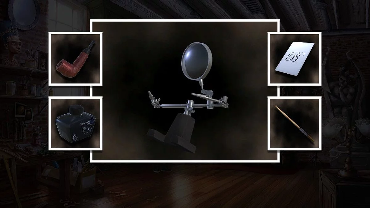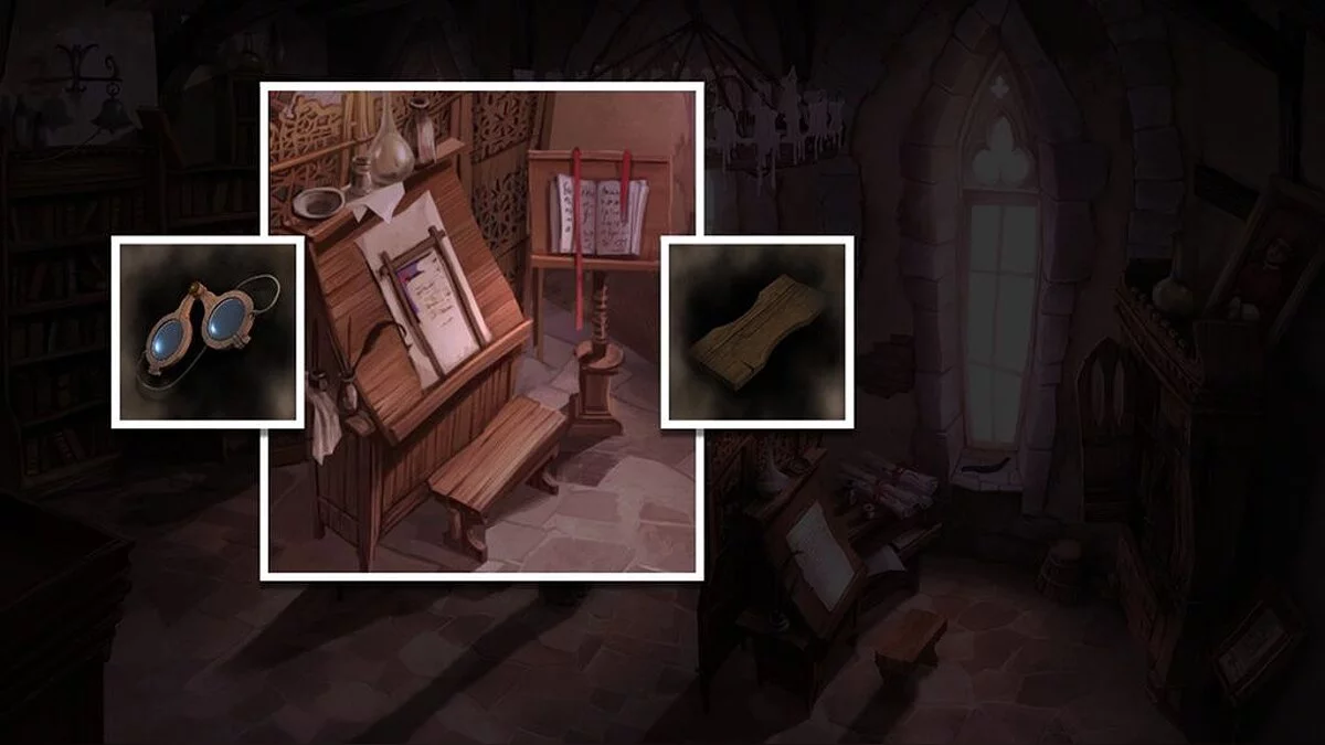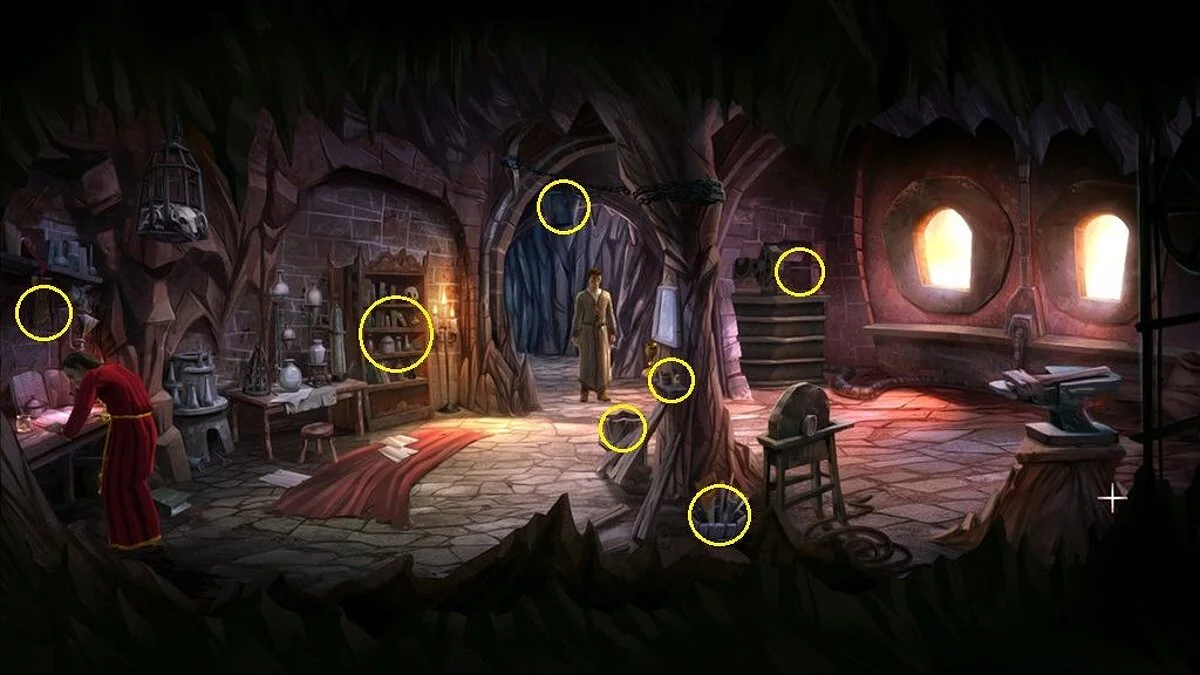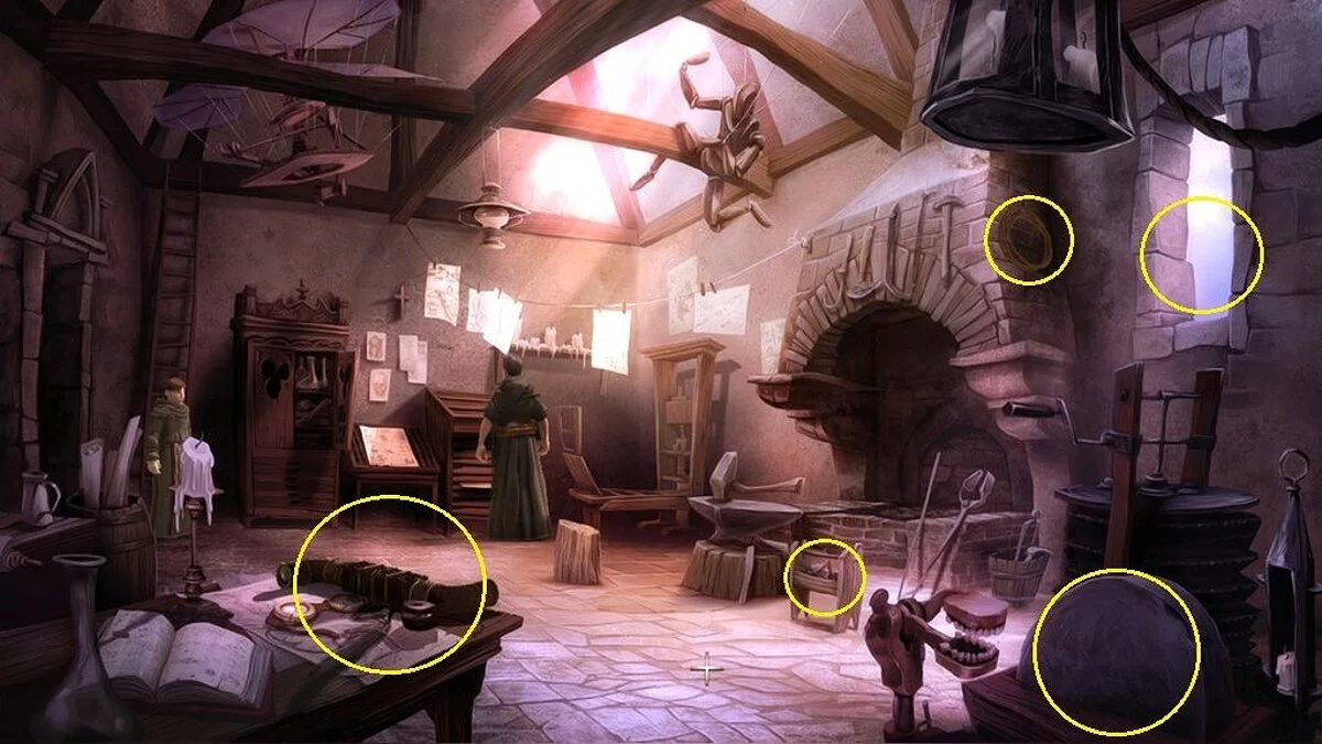 Настало время обыскать кабинет. Берём «пери-скоп» со стола, стамеску в ящике около наковальни и верёвку, висящую слева от инструментов. Стамеской выковыриваем последнюю литеру «Е» из формочки, а потом выглядываем в окно с целью найти потерянные очки, используем соответствующую подсказку. Находим их и достаём, предварительно обмотав на поясе верёвку, чтобы суметь дотянуться до них.