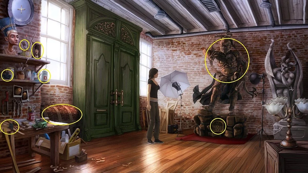Управляем Паулиной. Подходим к столу с верстаком справа от входа, осматриваем все полки и забираем фиксатор для краски, кисточку, чернила и молоток. Затем пытаемся открыть сундук, что стоит возле. Открываем боковые застёжки — для центральной нужен пластмассовый молоток. Выходим на улицу, кликаем на Бориса, говорим ему о пластмассовом молотке, применяя соответствующую подсказку, после чего получаем инструмент.