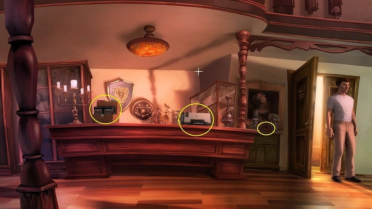 Возвращаемся в мир реальный, шаримся в ближайшем к нам шкафу, откуда берём тарелку с солью и циркуль. Затем подходим к центральной парте, находим на ней пустую катушку. Прежде чем выйти из комнаты на улицу, разговариваем с Торибио на любые темы. Входим к Хинесу, видим, что он прячет ключ от тайной библиотеки у себя в столе. Беседуем с ним обо всём и выходим. Он нам больше не понадобится.