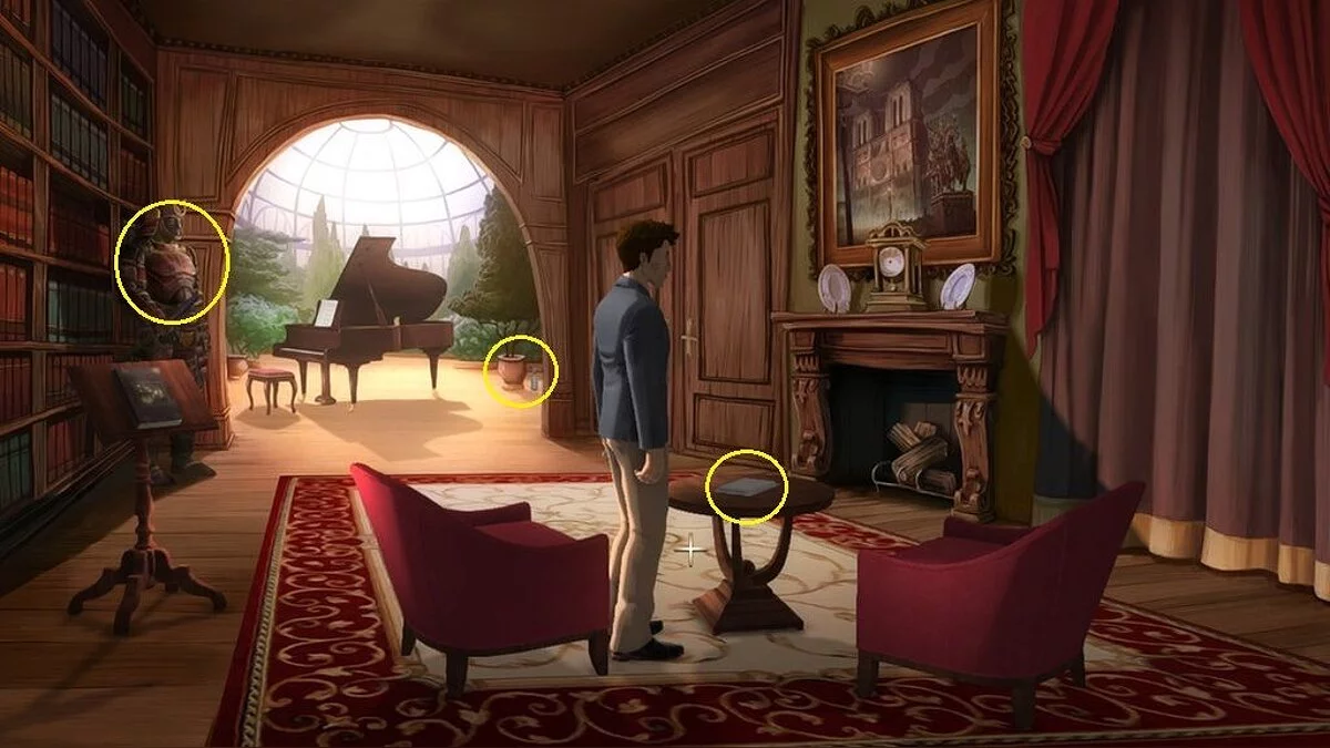Открыть упакованную книгу о сектантах нужно, не повредив её. Приступаем. Для начала подходим к горшку с растением, стоящему возле рояля, осматриваем его и смазываем карту, полученную от Виктории, смолой деревца. Затем подбираем пульверизатор возле горшка, а потом изымаем катану у статуи самурая.