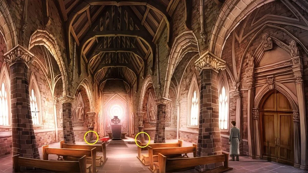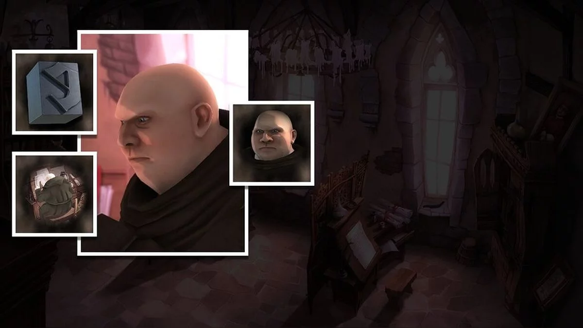 Возвращаемся в самую первую залу. Осматриваем Торибио, замечаем зашитую дырку на его одеянии и предполагаем, что это могла быть воровская прореха. Не ошибаемся и понимаем, что именно Торибио украл литеры «Е». Выходим на улицу и смотрим в окошко между дверями с помощью «пери-скопа», наблюдаем за переписывающим бумаги монахом (появляется соответствующая подсказка — шпион). Затем отдаём ему последнюю литеру «Е», чтобы проследить, куда он спрячет её, будучи вором с прорехой в боку. Его тайник — одна из книг на полке напротив него.