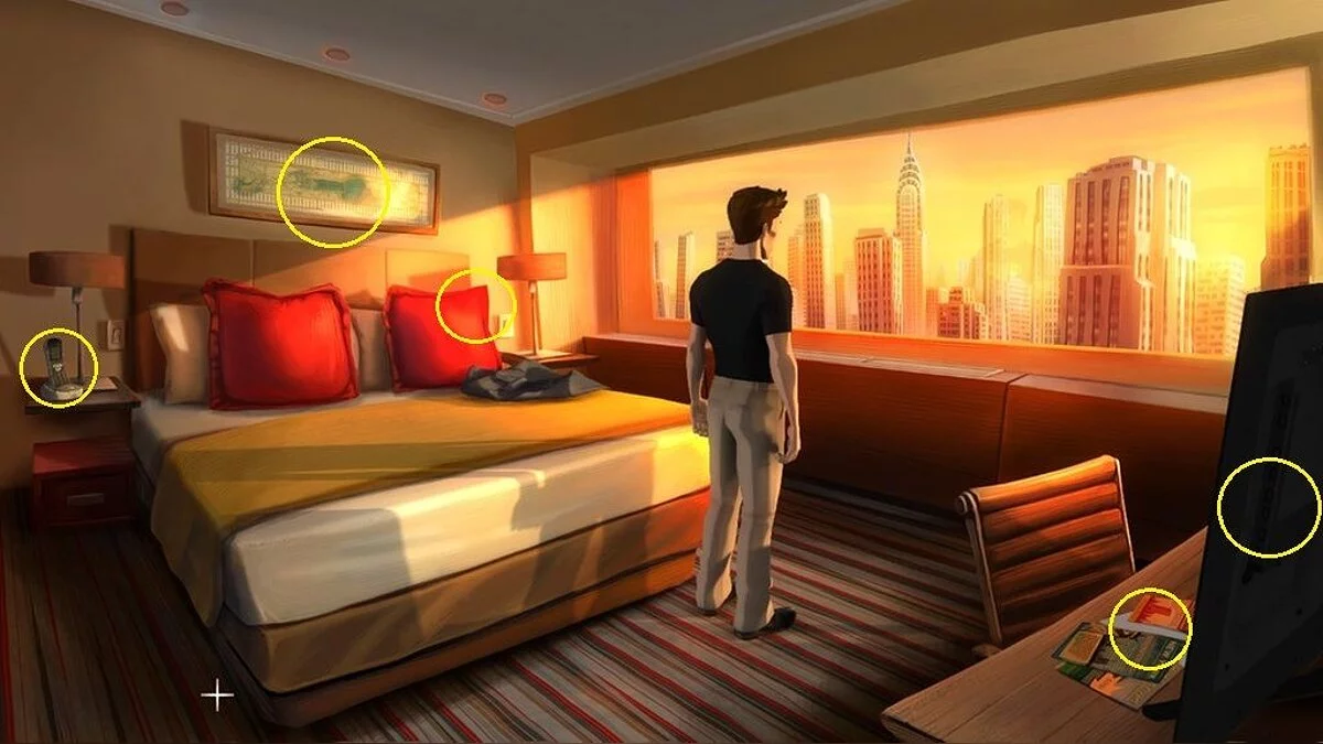 Вставляем флешку в телевизор, смотрим видеоролик и понимаем — нас приглашают на встречу. Для определения её местоположения достаём из ближней к окну подушки ультрафиолетовый фонарик и светим им на карту, висящую над кроватью. Активная точка подскажет нам, что нужно идти в парк.