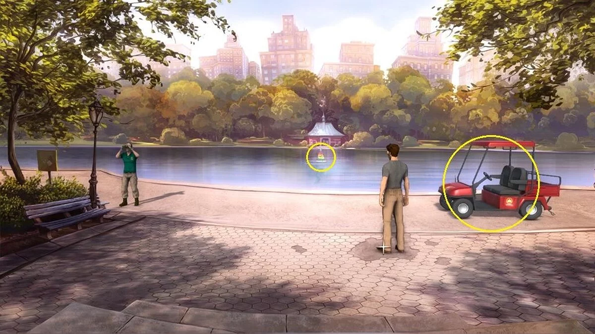 Вновь разговариваем с садовником, спрашиваем у него о собаке, поражаем его любовью к животным, и он одалживает нам бинокль. С помощью него рассматриваем маленькую игрушечную лодку в центре пруда и видим непонятный код из пяти цифр (всплывает подсказка пульт ду).