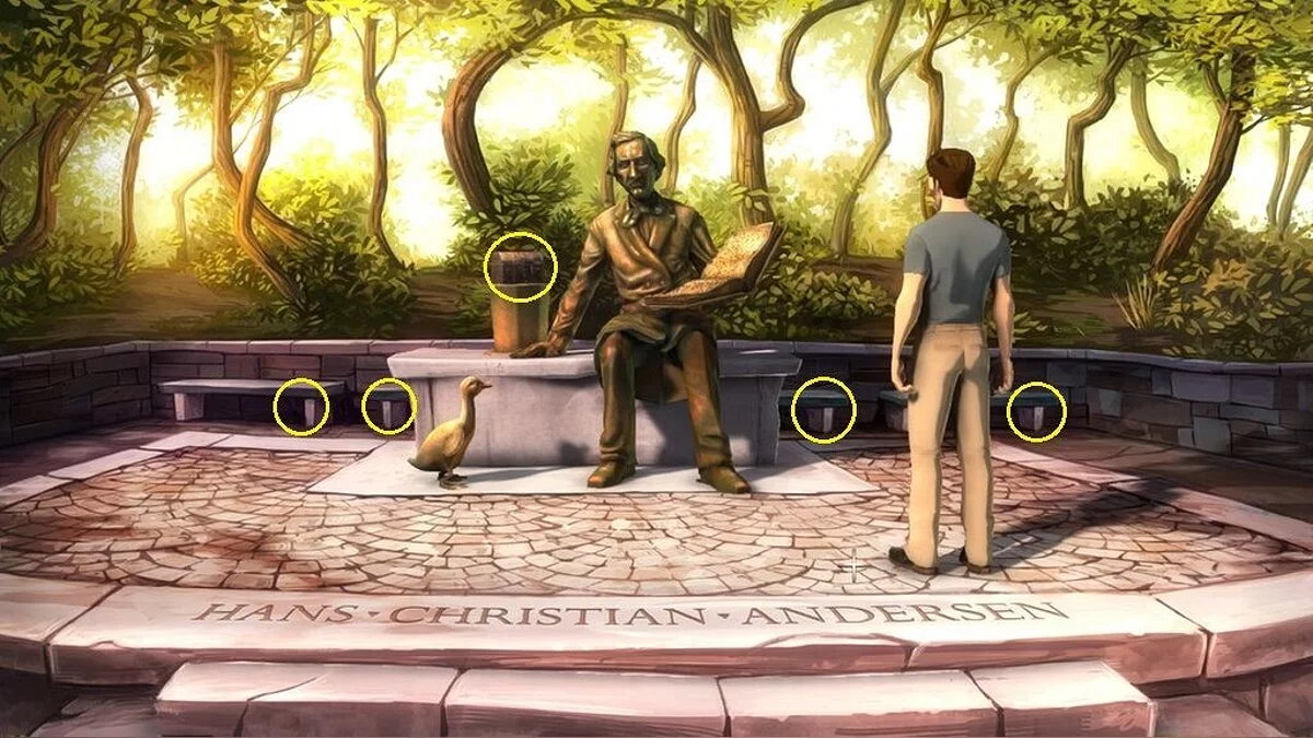 Идём к памятнику Ханса Кристиана Андерсена и разговариваем с ним как только можем, после чего начинаем искать ключ от ларчика, возвышающегося на постаменте около статуи датского сказочника. Заглядываем под все четыре лавки, установленные по бокам от статуи, и находим под ними пульт радиоуправления, кабель, фотографию той самой книги и свой портрет.