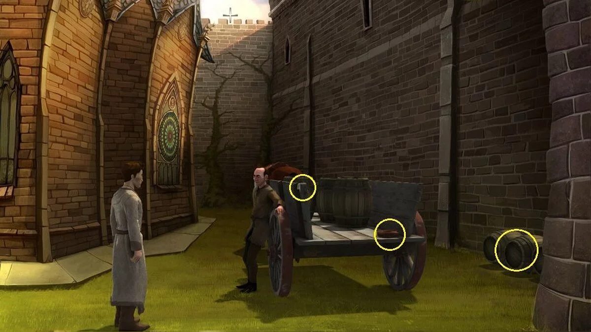 Около левого крыльца цервкушки замечаем повозку и подходим к ней. Болтаем с кучером, приглядываемся к бочкам, размышляем о побеге и пока ещё не берём кожаные ремни. Осматриваем колесницу и незаметно высыпаем сонный порошок на тряпку, которой извозчик вытирает лицо. Тот падает без сознания, а мы забираем ремни.