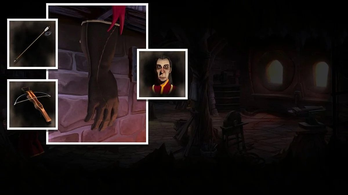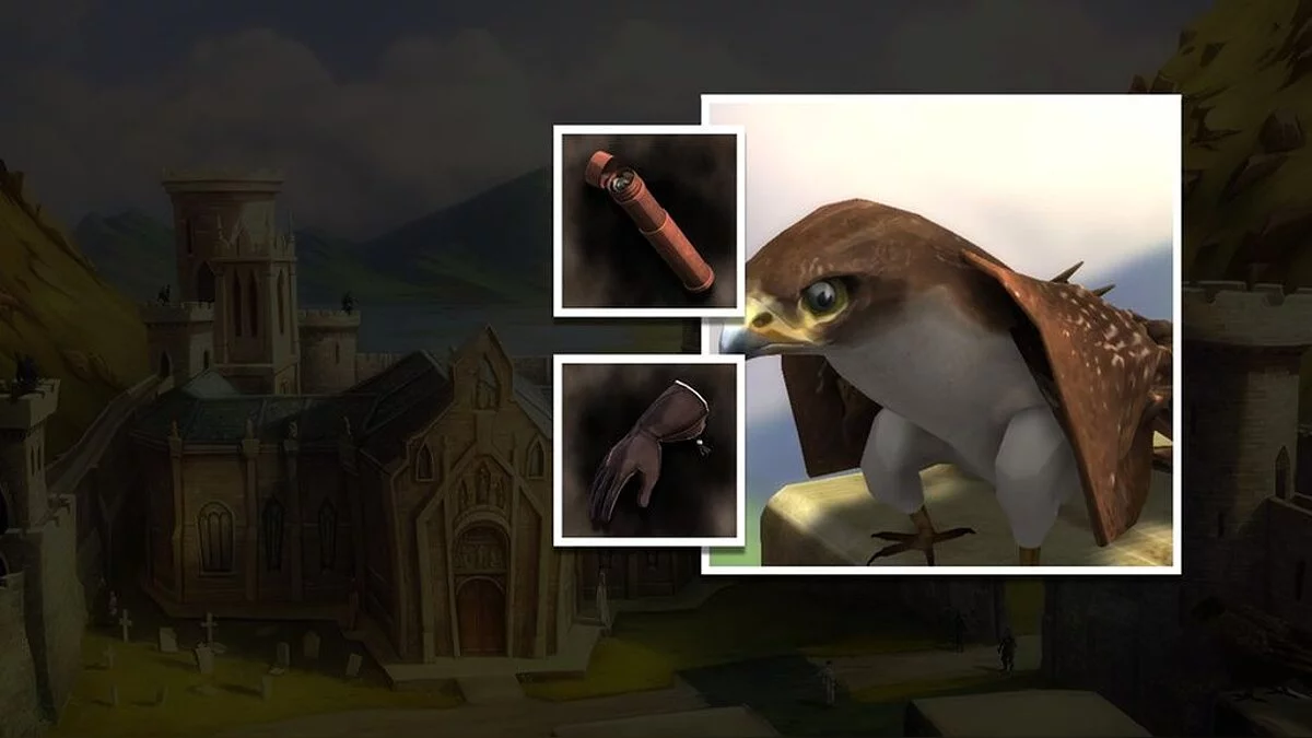 Отвлечь старика нужно для того, чтобы незаметно завладеть сокольничьей перчаткой, висящей прямо перед ним. Запасаемся ещё одним камешком, а потом привязываем к концу стрелы нить, намотанную на катушку. Выпускаем теперь уже длинную стрелу из арбалета в перчатку, не забывая об отвлекающем манёвре — саботаже.
