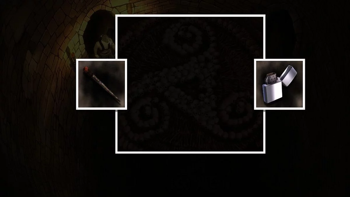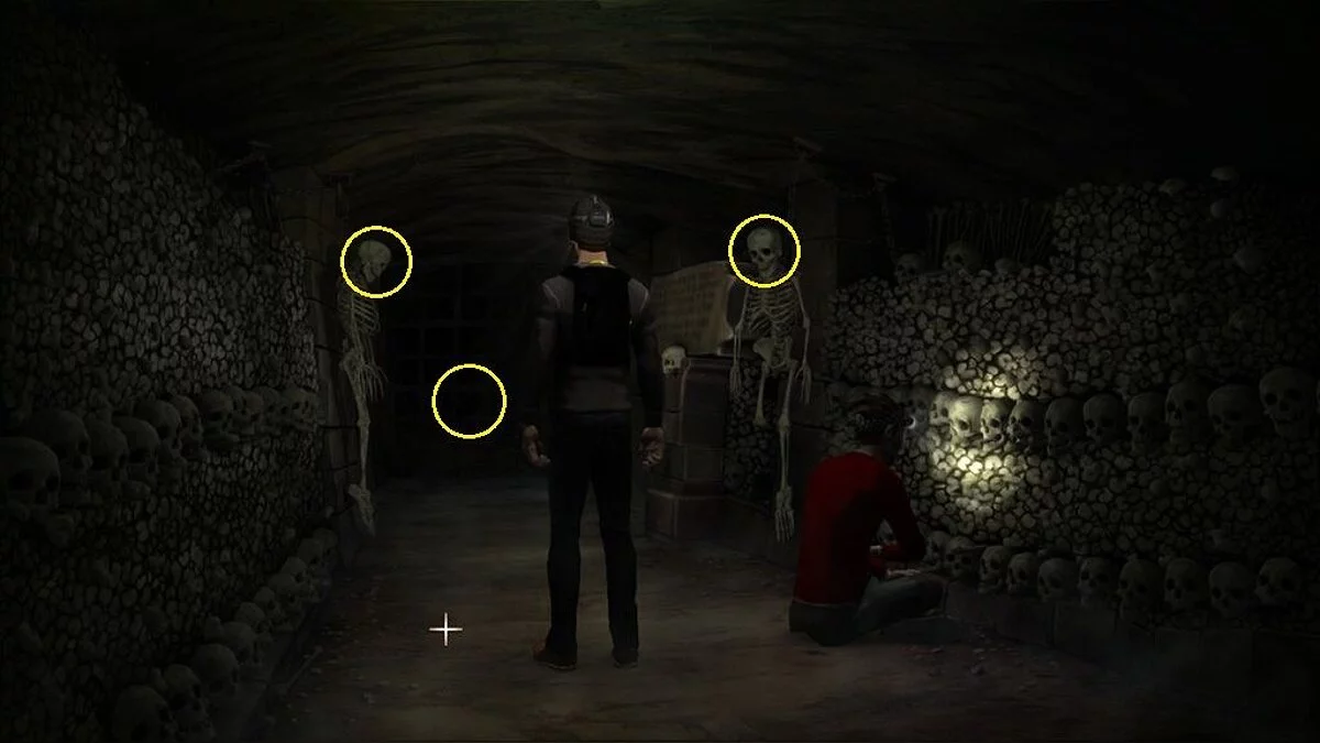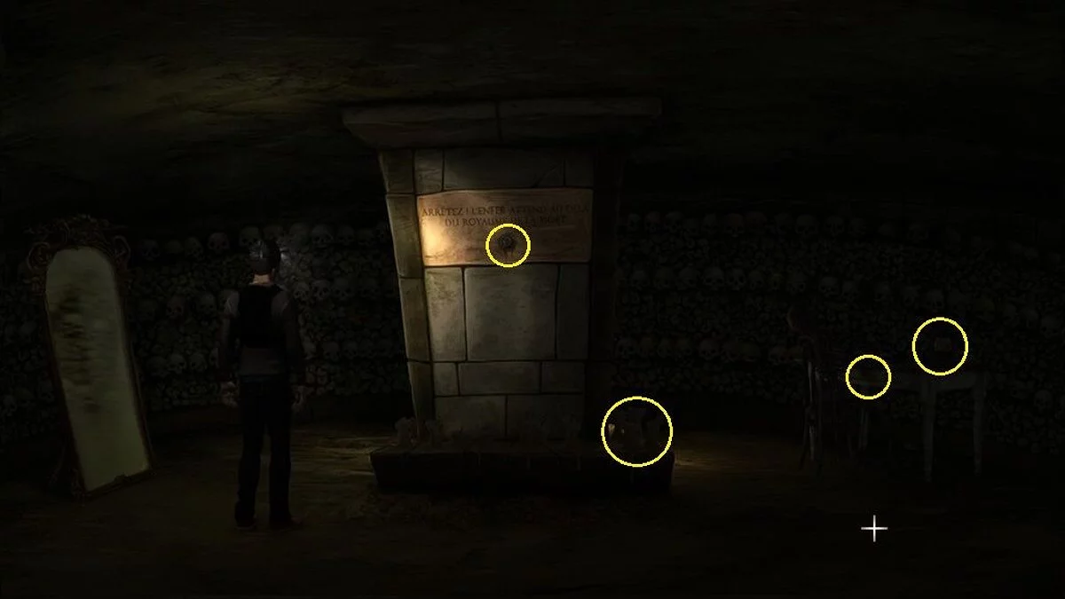Оказываемся в другой комнате с черепами в стенах и для начала зажигаем свечи внизу центральной колонны, используя зажигалку. Потом читаем предостерегательную надпись и замечаем под ней отверстие для амулета. Вставляем его туда, пытаемся крутить и понимаем, что ничего не получается. Подходим к столу справа, берём стоящую на нём керосиновую лампу, а из выдвижного ящика достаём письмо Фергуса Куинлана, основателя ордена Яго.