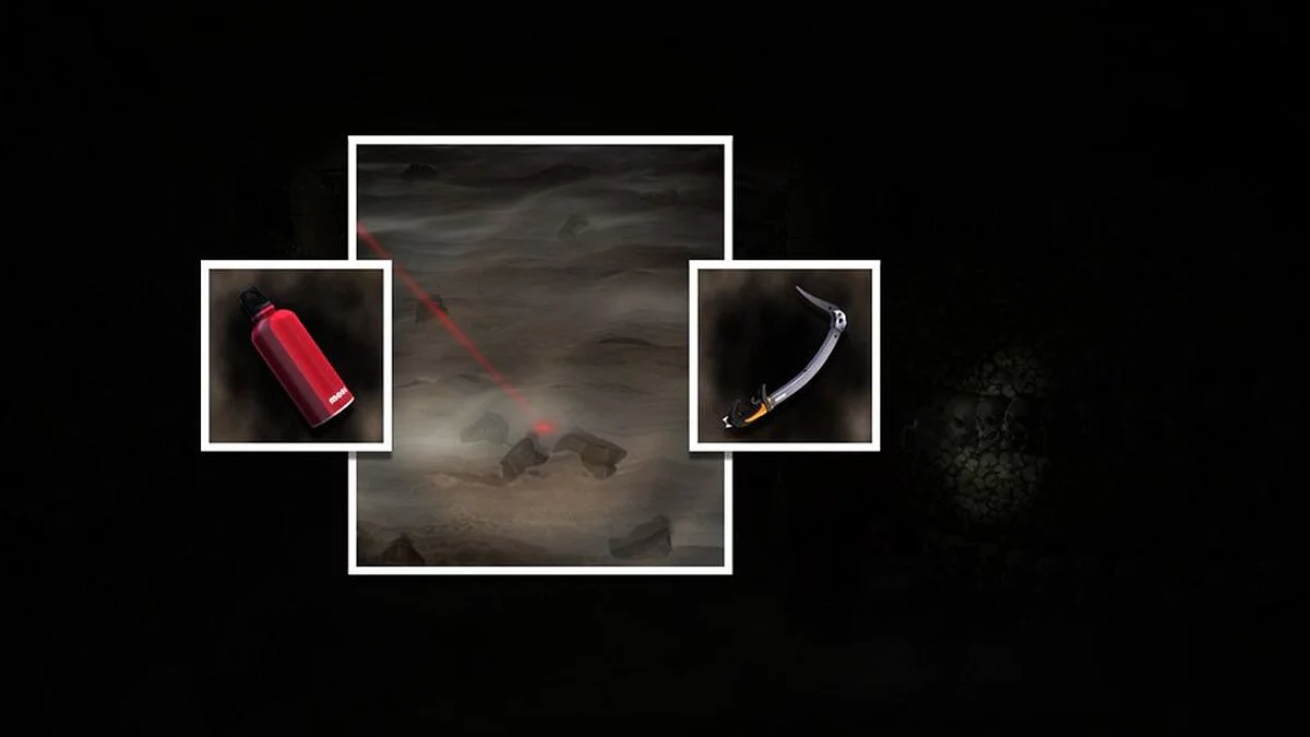 После этого поочерёдно разглядываем оба скелета, вставляем в их носовые отверстия лазерную указку, смотрим, куда падает красный луч из каждого черепа, раскапываем землю в этих местах ледорубом, предварительно полив её водой, а затем вставляем прут в вырытые из-под земли стальные отверстия, чтобы выдвинуть какие-то столбики. Далее просовываем прут между столбиками и проворачиваем его по кругу, чтобы открыть калитку.