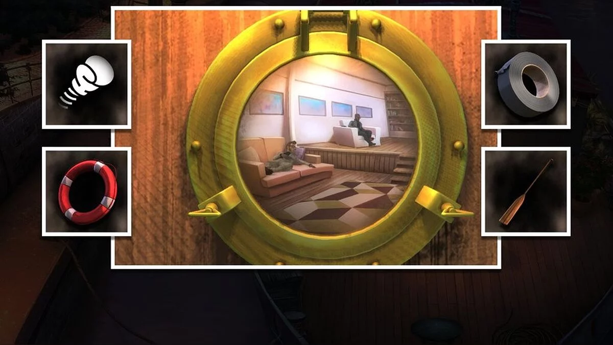 Возвращаемся на палубу, смотрим на лысого головореза в окошечко и продумываем план избавления от него, комбинируя элементы: сначала сюрприз, затем обездвиживание спасательным кругом, потом удар веслом и связывание изолентой. Выводим гангстера из строя.