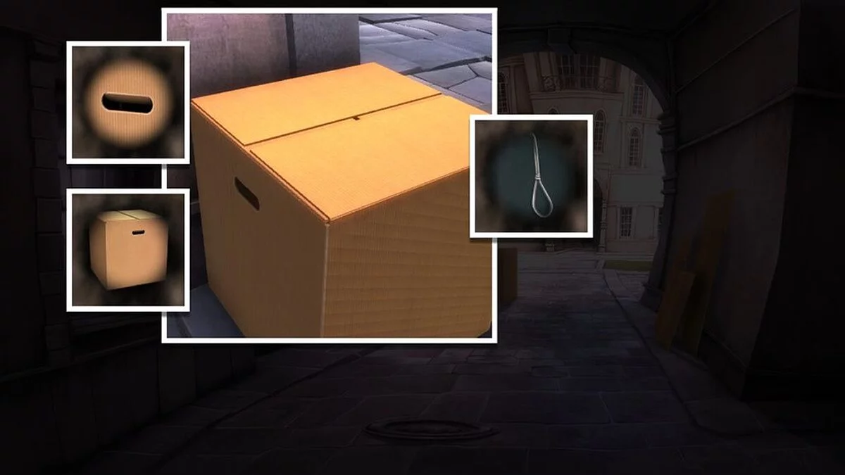 Теперь разглядываем коробку, стоящую слева от двери в подвал, и обнаруживаем, что отверстие в ней достаточно велико, чтобы просунуть туда руку (всплывает информация о ручке коробки). Затем берём три картонных листа разной величины и, поочерёдно складывая их, заменяем первоначально стоящую на углу коробку коробкой побольше, а последнюю ещё большей по сравнению с ней коробкой. Так два раза.