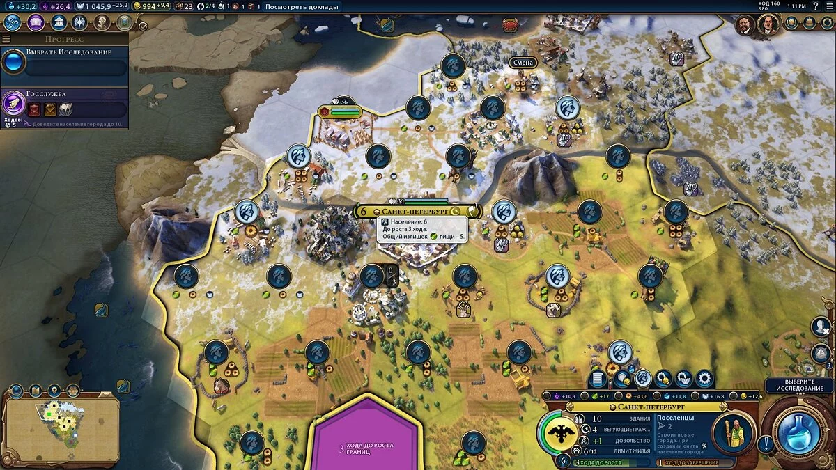 Если у вас живет мало людей в городе, то иногда даже нет смысла строить здания, требующие население для обеспечения, или улучшать гексы вокруг — они просто никак не будут задействованы.