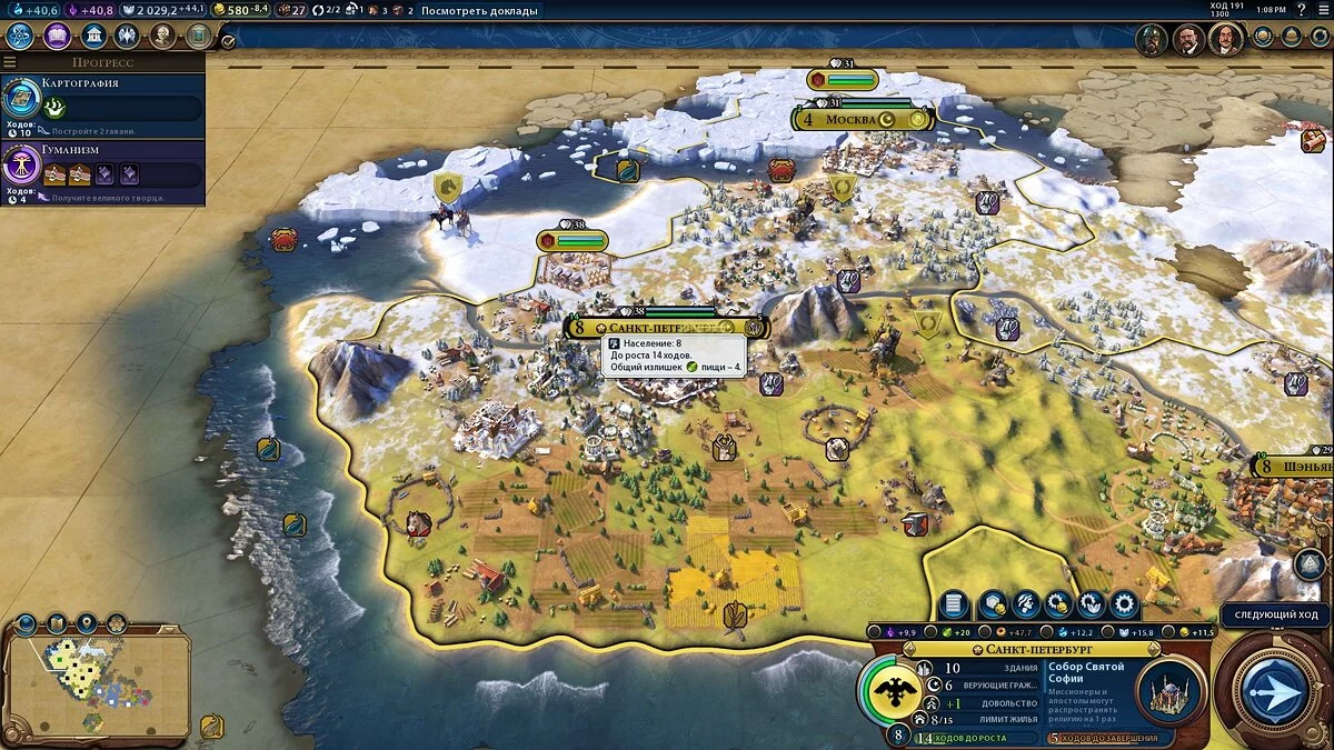 Чем больше граждан в ваших городах, тем больше объектов и клеток они обрабатывают, повышая количество очков науки, культуры, производства и денег.