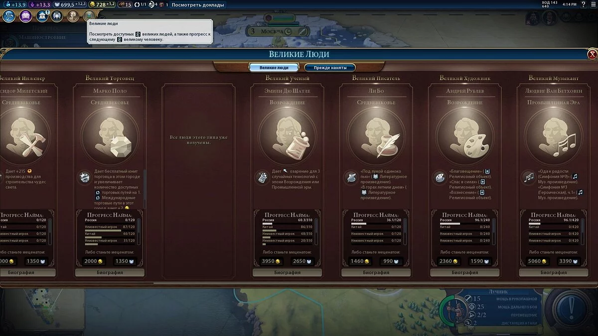 Именно поэтому цивилизации соревнуются между собой за того или иного Великого человека, топ-4 и число оставшихся ходов до возможности призыва можно увидеть на соответствующей странице. Никогда не игнорируйте возможность легко или дешево заполучить Великого человека — не подберете вы, подберет кто-то другой. С другой стороны, иногда лучше пропустить эпоху, чтобы иметь гарантированный успех в следующей. Не все Великие Люди равны между собой, кто-то лучше, кто-то хуже.
