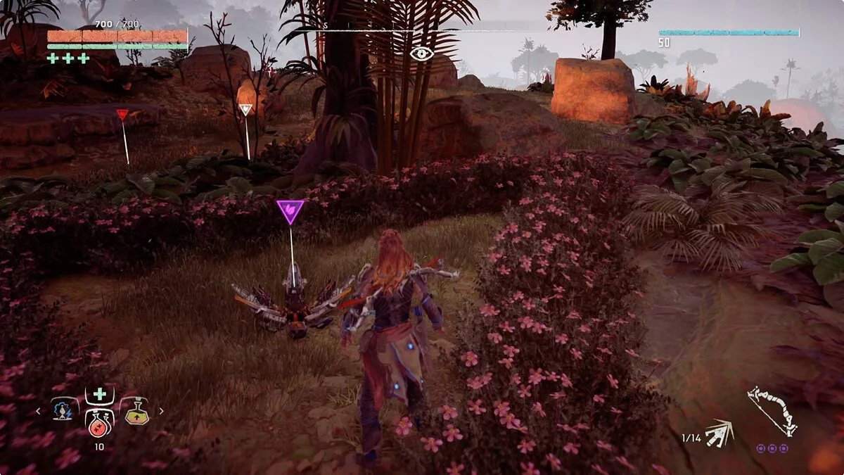Найти металлические цветы не так-то просто, потому что они могут быть в любом типе местности. И под землей, и на тропе, и среди кустов. Если вы находитесь недалеко от одного из экземпляров, Фокус подсветит его.
