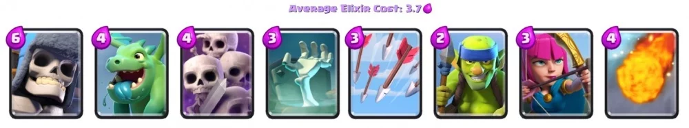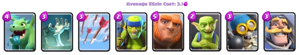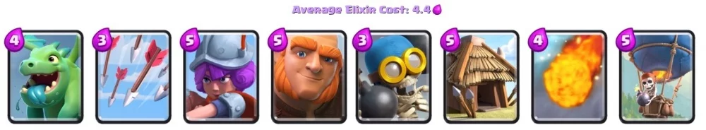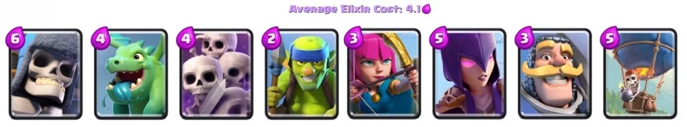 Такая колода будет рассчитана на прямые атаки. Здесь всё также есть гигантский скелет, но также появился не менее эффективный воздушный шар. Просто так его лучше не использовать, так что стоит позаботиться о защите с воздуха. К примеру, для этого вы можете использовать маленького дракона. Учитывайте, что прокачка данных карт будет непростой, так как они обе являются эпическими.