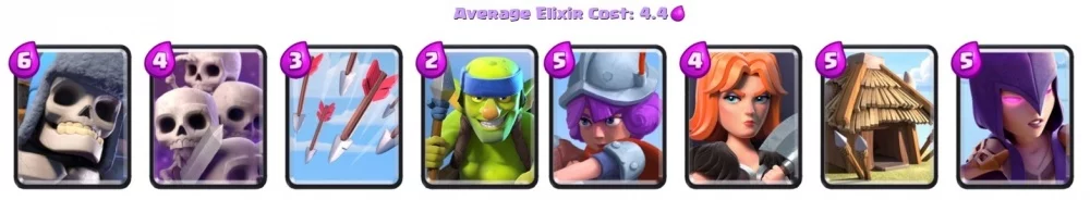 Данная колода будет полезна, если вы любите не нападать, а обороняться. Вам понадобится хижина гоблинов, а также гробница скелетов. Выставляйте их на одной половине поля и они будут давать постоянный прирост юнитов, что также усилит ведьму и гиганта.