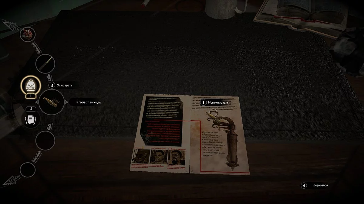 Как можно было догадаться, ключ не подошел, точнее подойти то он подошел, но вот решетка осталась закрытой. Если рассмотреть ключ внимательно, то понимаем, что чего-то в нем не хватает, как-будто из него что-то вытянули. Придется искать работающую версию. Возвращаемся в кабинет доктора Мангелинга. В ящике стола, покопавшись среди книг, отыскиваем журнал «Клиника Вальсембора». Полистав его, открываем страницу с изображением ключа. Затем открываем инвентарь, находим наш «неработающий ключ» и используем его на журнале. Все становится ясно — не хватает всего одной шпильки. Только где ее взять?