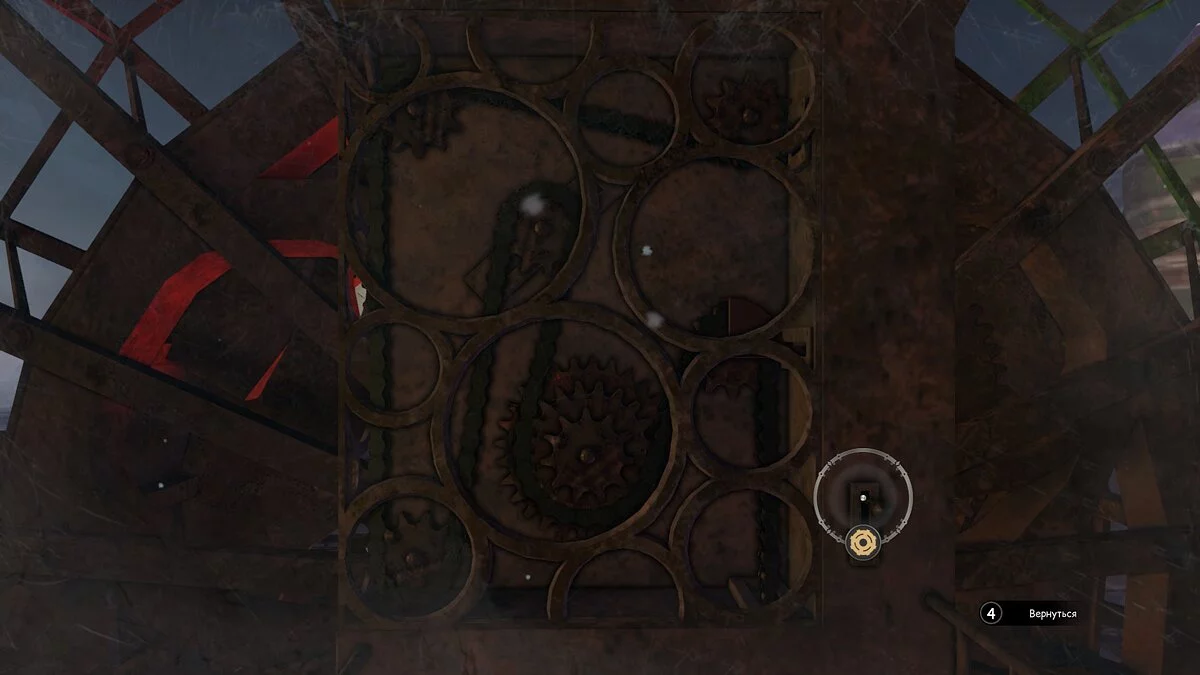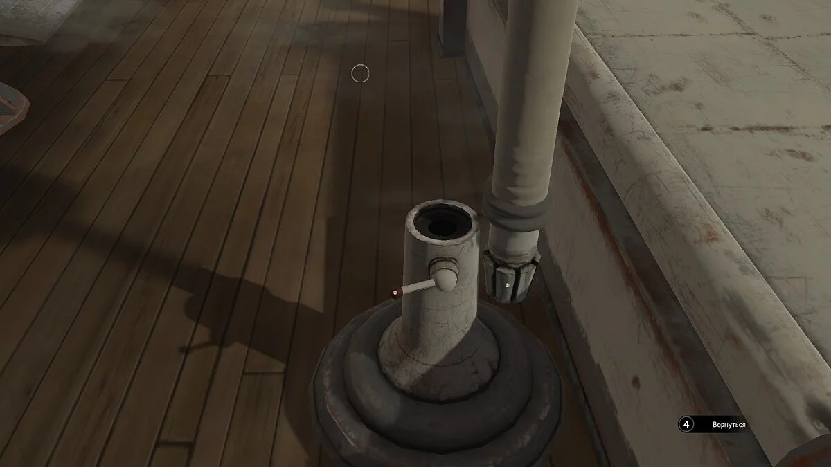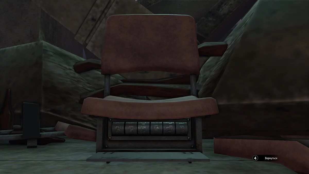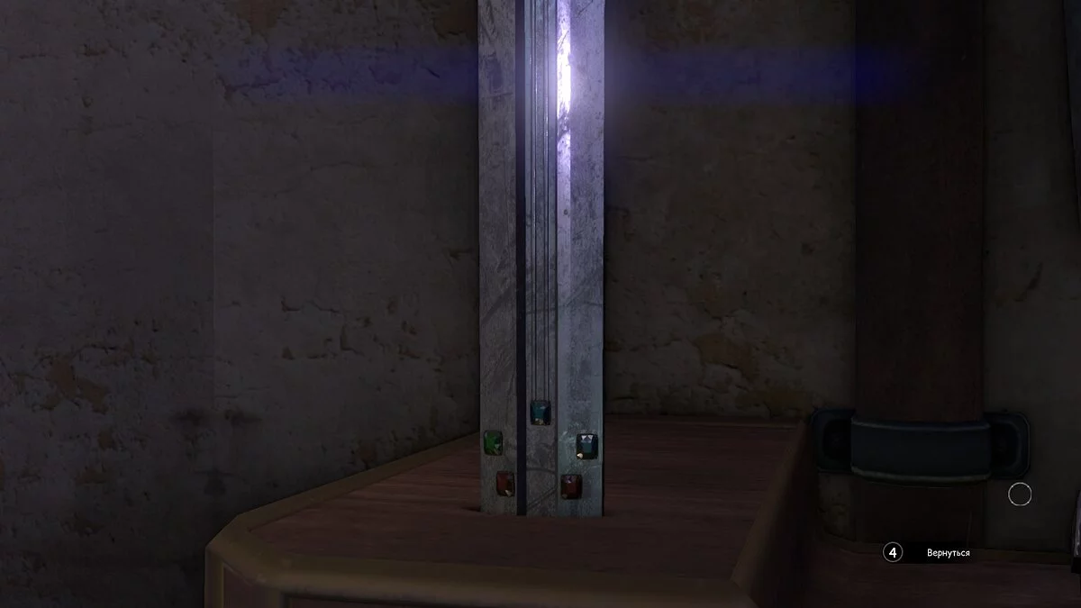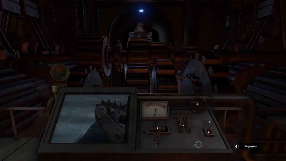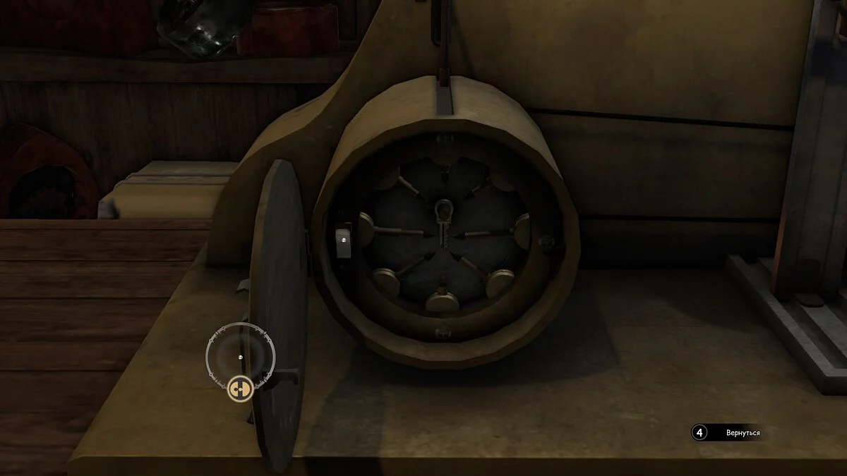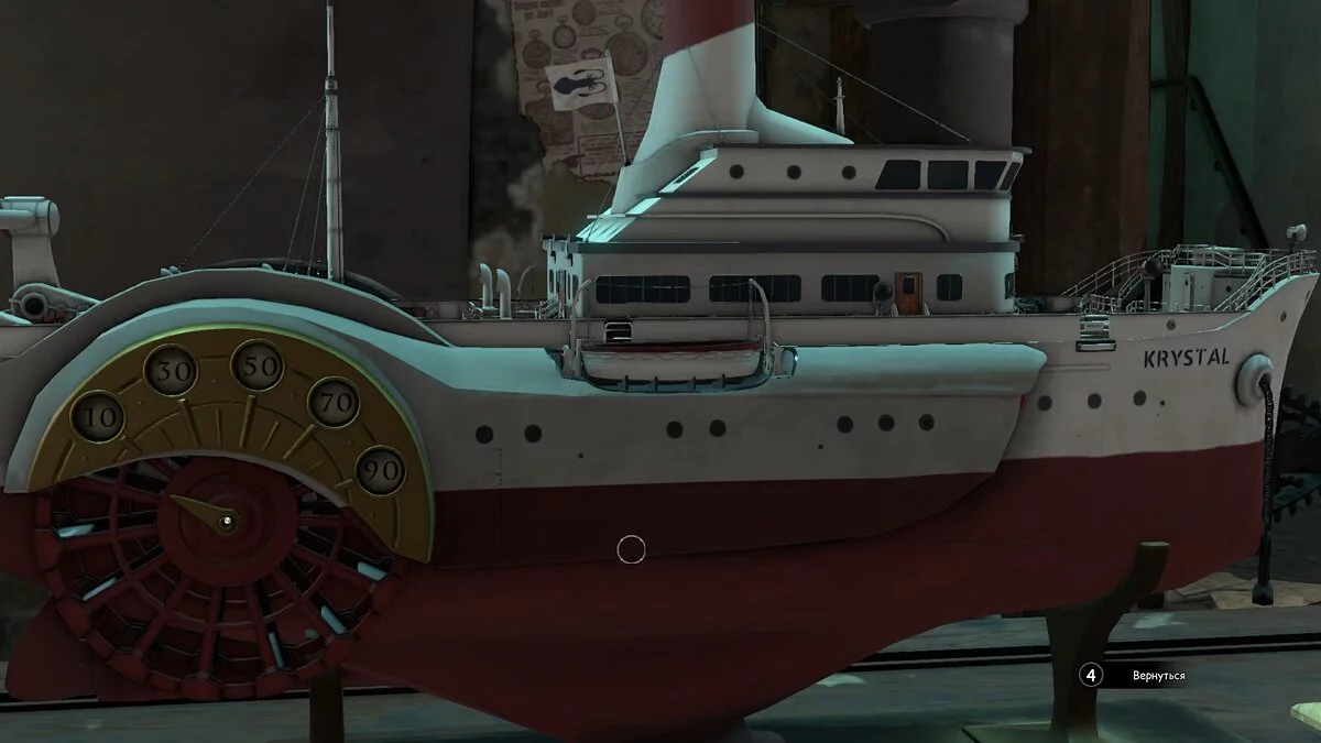 Какой проворный старикан, уже убежал в больницу к Замятину и ногу для Курка даже прихватил. Но в мастерской нас встретит Сара, которая не в курсе, был ли запасной ключ, но подскажет, что в подвале стоит макет «Кристалла», и даст нам рукоятку от запирающего замка. Спускаемся в подвал, вставляем ручку в замок под витриной, за которой стоит корабль, и получаем доступ к самой модели. Сбоку есть удобный тумблер — дерните его, чтобы включить освещение. Осматриваем заднее колесо на корабле и видим цифры со стрелкой. Нам нужно набрать следующий шифр: 30 — 80 — 60 — 100. Одно деление равно десяти. Чтобы получить 100, просто отклоните стрелку по максимуму и отпустите. С каждым успешным действием якорь будет опускаться все ниже и ниже. В конце концов мы сами должны будем потянуть его вниз до упора. После этого верхняя часть корабля отъедет в сторону и покажется часть ключа. Мы ее повернем и достанем ключ целиком.