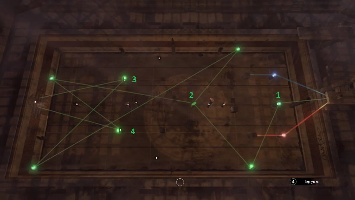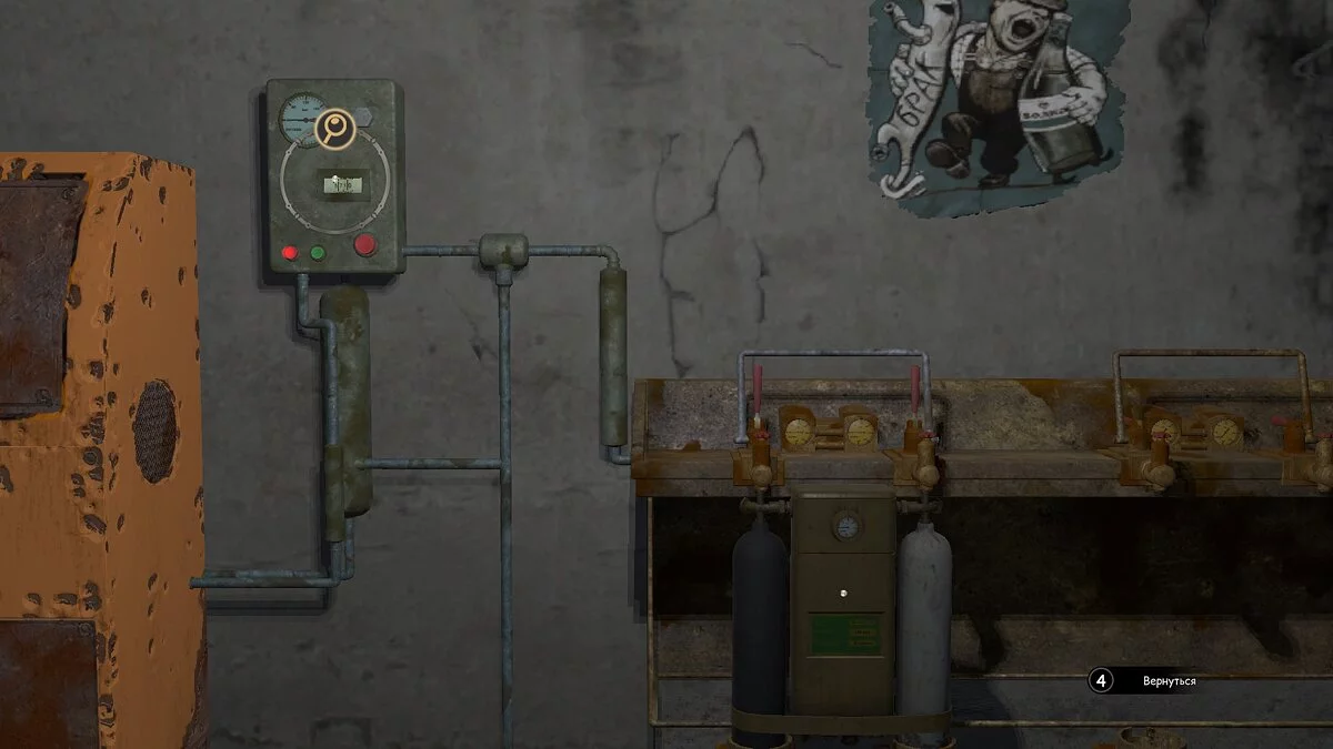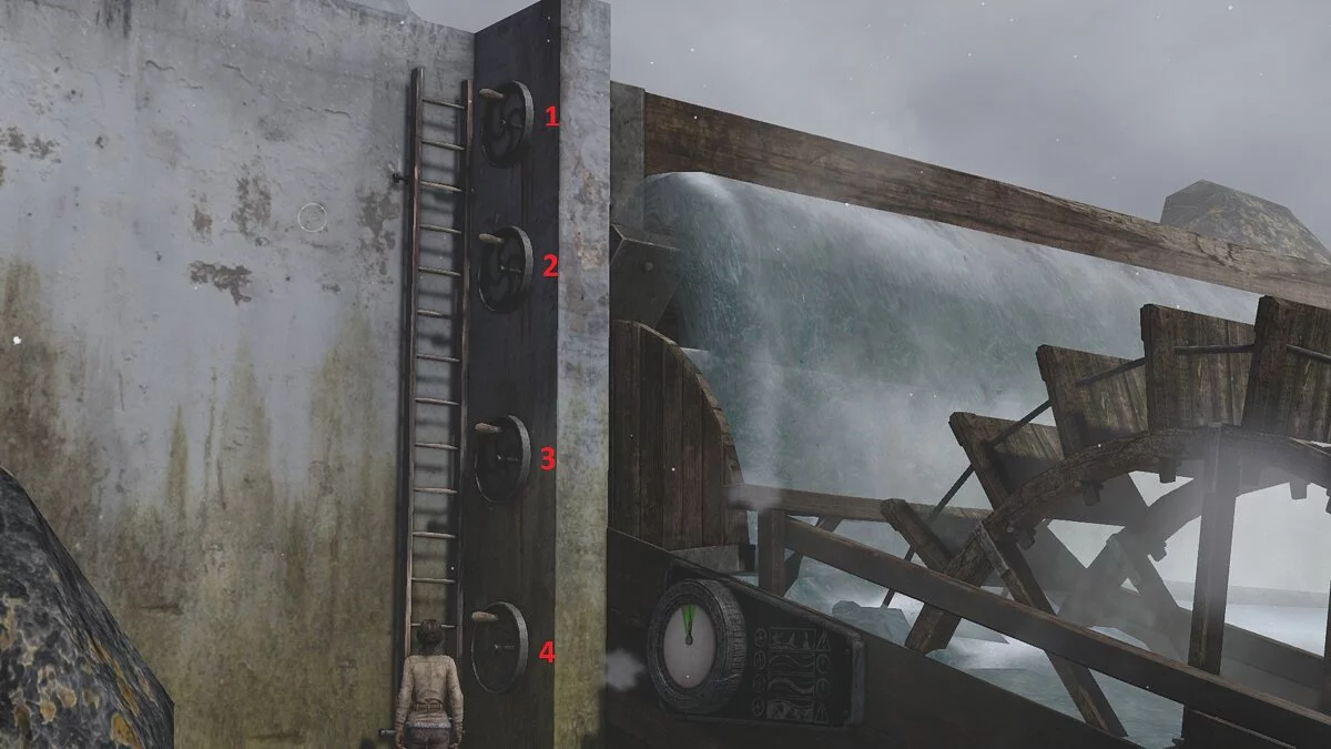Пара страусов уже успели отравиться водой из озера, и нам придется помочь юколам — все-таки помогли нам эти ребята. После разговора с женщиной-шаманом отправляемся вправо от шатра. Нам нужно вернуться к дамбе, которую мы проплывали, сбегая из клиники. Собственно, там нас ждут четыре вентиля, регулирующих напор воды (они пронумерованы от 1-го до 4-ех на скриншоте ниже). Если крутить против часовой стрелки, то створка закрывается, и вода в этом месте пройти не может, а если в обратном направлении, то вода увеличивает напор. Благодаря подсказке рядом с показателем давления на плотину, мы выясняем, что вентили 1 и 4 следует перекрыть полностью (до упора против часовой). А вентили 2 и 3 должны быть открыты, но если открыть их полностью, то напор будет слишком силен. Нам надо, чтобы стрелка барометра оставалась в зеленой зоне, поэтому аккуратно подкручиваем вентиль 2. То есть вторая створка должна быть лишь приоткрыта, как вы можете видеть это на изображении ниже.