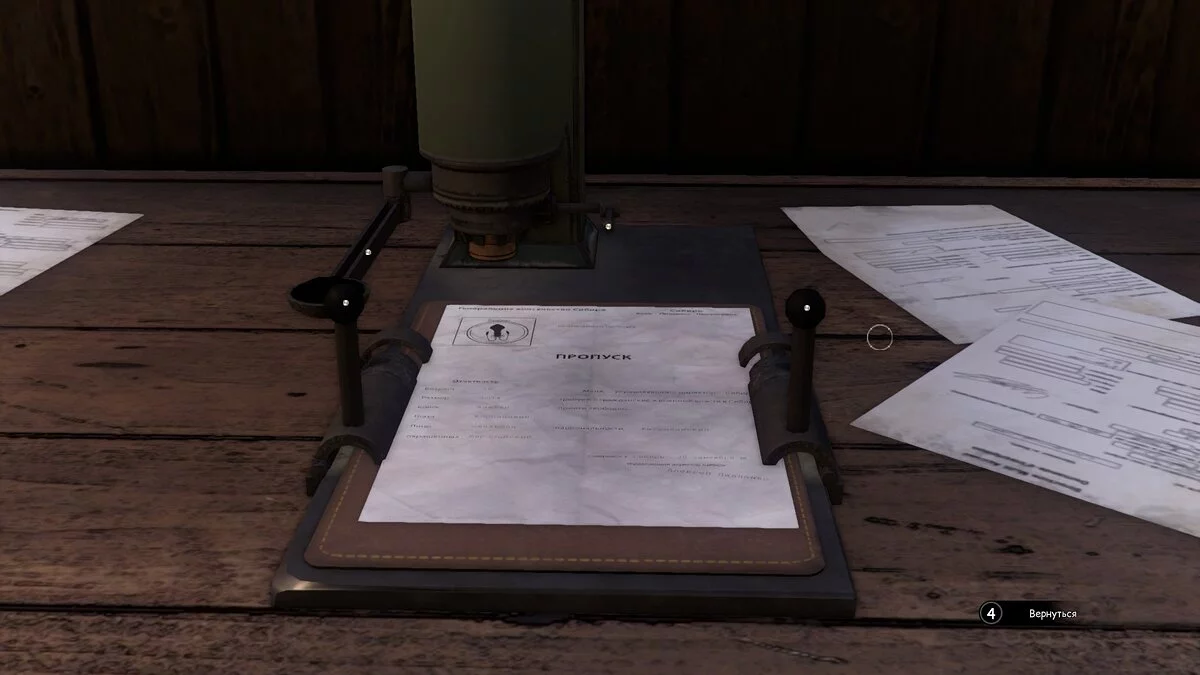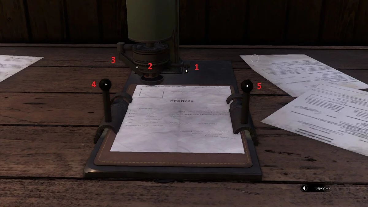 Кладем подкладку, на нее ложится сам бланк, затем фиксируем бумагу зажимами «4» и «5» (см. скриншот ниже), губку кладем на подставку «3», где мы ее и взяли, теперь используем печать в месте под номером «2» и зажимаем ее, повернув вниз рукоятку «1». Подставку «3» пододвигаем под печать и используем аппарат. Затем эту подставку «3» нужно отвести в сторону и еще раз делаем штамп, только уже на документе. Вот и все, убираем зажимы «4» и «5», забираем документ. Но рано радоваться, в сторожку входит тот самый детектив Кантин, с которым мы беседовали через компьютер Ефимовой.