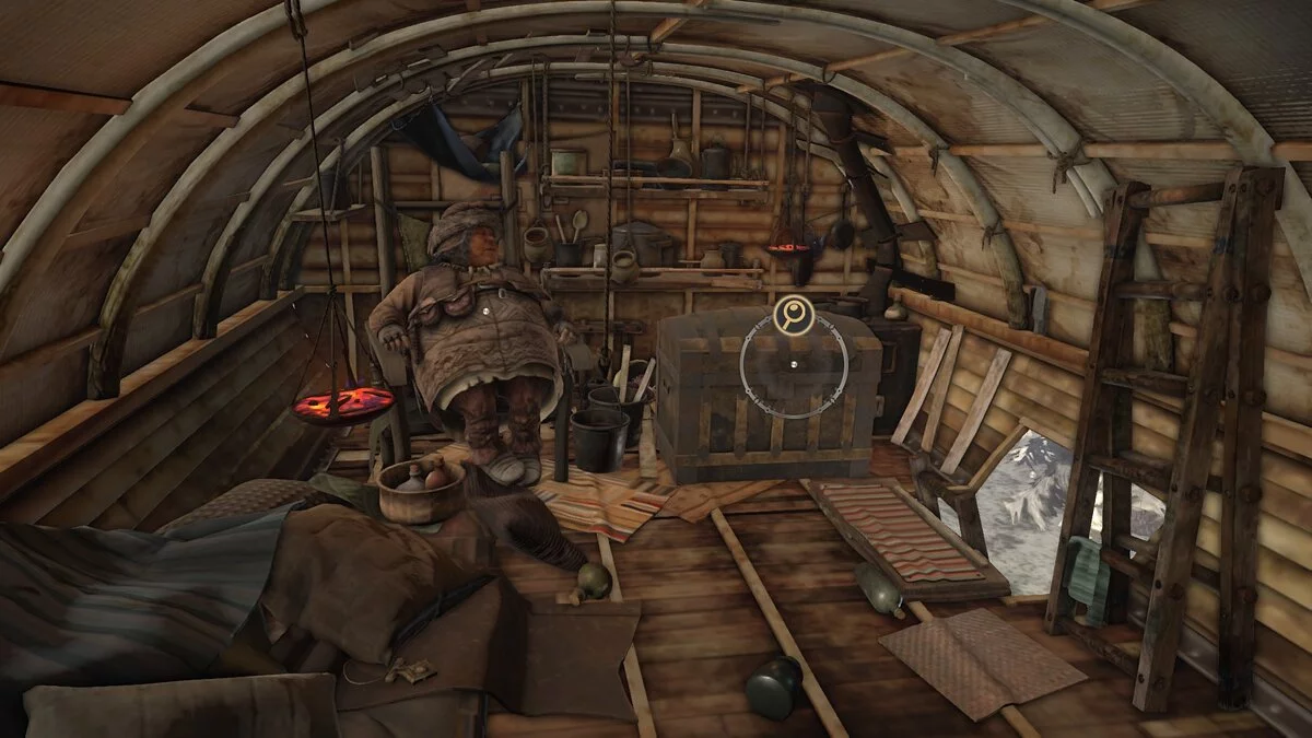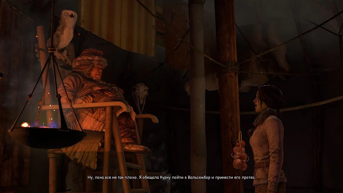 Пришло время вернуться обратно в лагерь, где нас встречают как героя. Но нам нужно к Аяваске. Заходим в шатер и идем налево к статуе не то кальмара, не то осьминога. На самом деле, это существо называют Квилаком, и живет оно на дне озера. В противоположной стороне от статуи находится комната шамана, туда нам следует заглянуть. После диалога с Аяваской узнаем, что нам нужно достать пропуск, если мы планируем попасть в Вальсембор. Этим мы и займемся.