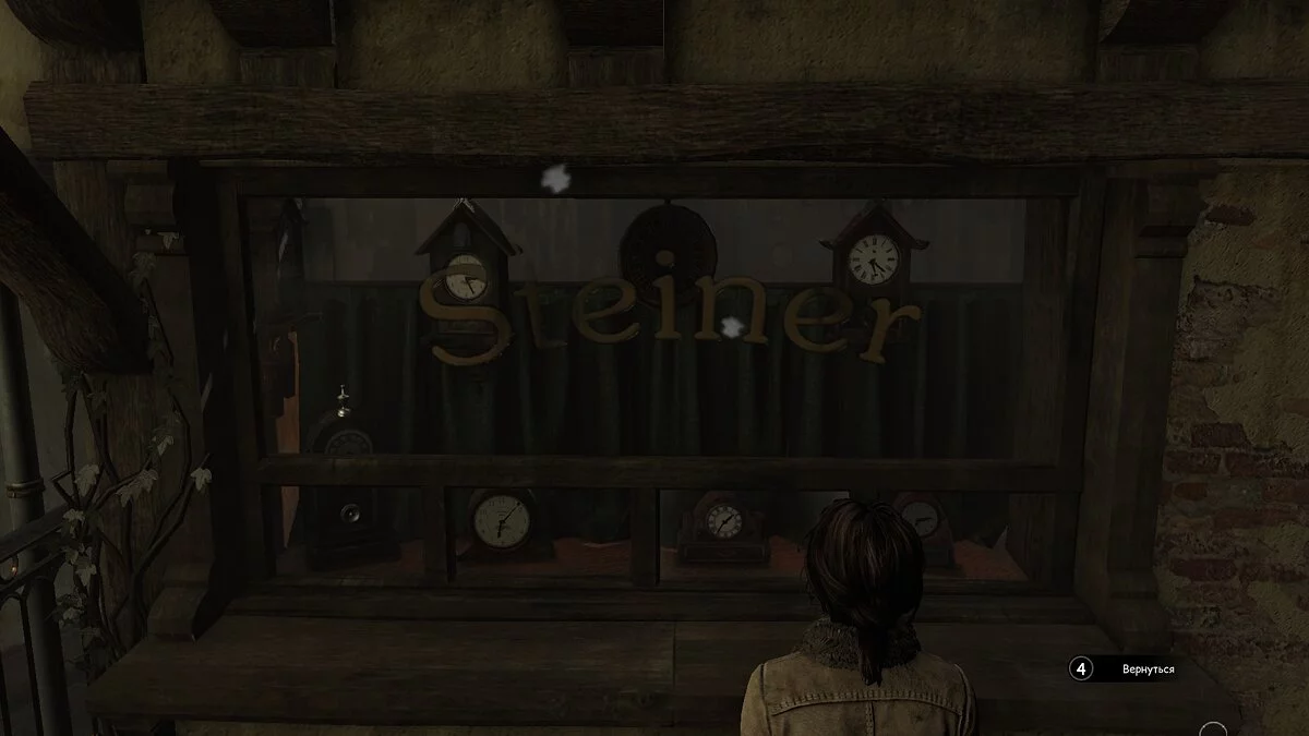 В мастерской сразу встречаем мистера Штайнера. Тот сильно заинтересовался нашим медальоном, сердцем Оскара. Понервничав, старик хватается уже за свое сердце. Надо помочь ему — найти таблетки. На стойке напротив часовщика берем кружку. Можно исследовать ящики стола, за которым сидит Штайнер. Это даст нам подсказку, что обычно старик должен принимать таблетки во время полдника. Еще одна подсказка висит на стене в подвале. Идем к старику и взаимодействуем с часами за ним. На нижнюю подставку кладем кружку, после этого открываем стекло и устанавливаем стрелки на 5:00. Именно в такое время Штайнер обычно принимает свои лекарства. Теперь мы видим, что часы начинают бить и появляются таблетки. Отдаем лекарство старику.
