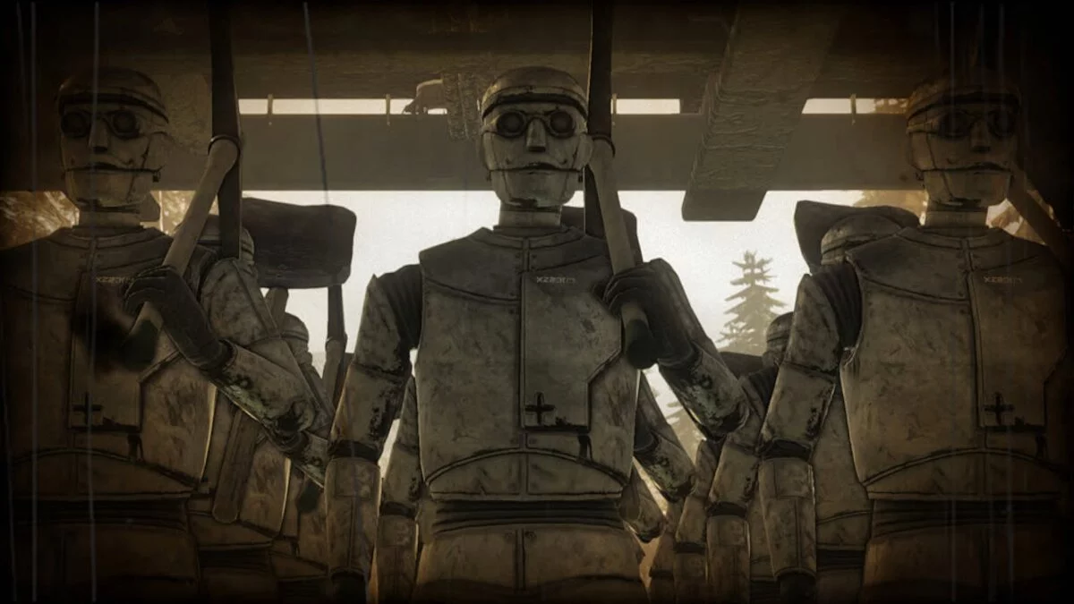 Идем к автоматону у входа в парк и, наконец, заводим его сердце. Оскар снова с нами! И ему отнюдь не нравится перспектива ходить «голым». Придется снова сгонять к Катерине и попросить у нее одежду ее покойного мужа. Она не против, если мы вернем ключ от парковых роботов. Соглашаемся, и Оскар получает крайне модный костюм.