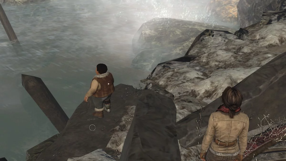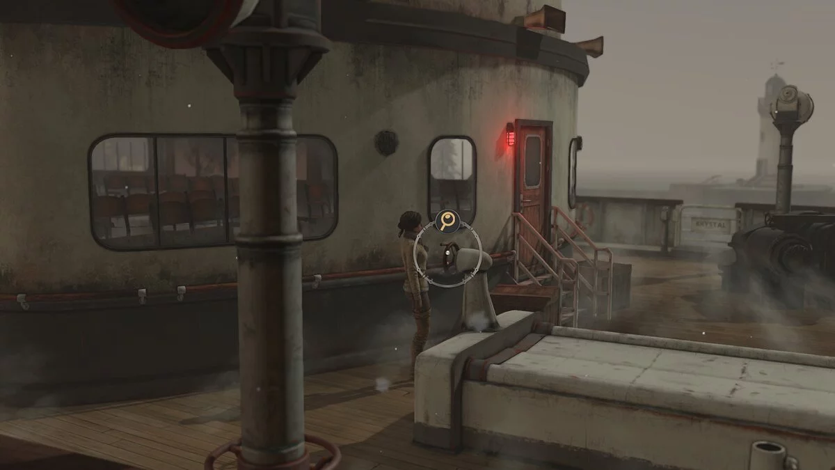 Спускаемся на пляж с деревянного причала по прислоненной доске. Чуть вдалеке видна лестница, а рядом с ней на лавочке сидит автоматон. Кейт сразу подмечает, что в него можно вставить сердце Оскара, но пока мы не сможем вскрыть нагрудную пластину, поэтому вернемся к нему попозже. По лестнице пока не поднимаемся, а идем в деревянный домик в конце пляжа. Поднявшись по лестнице, изучите веранду этого домика — там лежит «автоматический щуп». Теперь возвращаемся к нашему кораблю и снимаем при помощи щупа провода со столба. Рядом стоящий коротыш Бурут «заверяет», что сможет вставить их в розетку, и мы поверим ему.