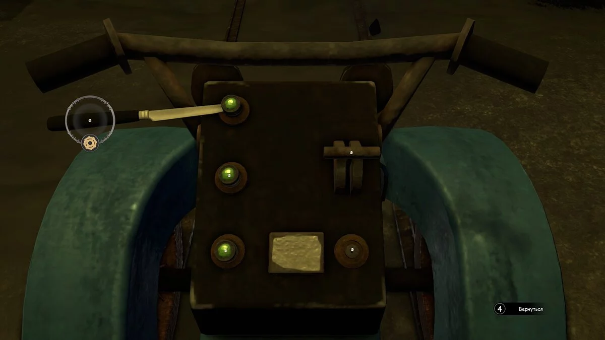 Наполнив тележку, Кейт уже не сможет так просто толкать ее. Придется задействовать синий драндулет, который стоит у дальней стены. Но прежде чем садиться за него, дерните за рычаг, который мы видели чуть ранее, чтобы изменить направление рельс. Теперь садимся за машинку: видим 3 кнопки и один пустой слот на панели управления. Нажатия на эти кнопки не приведут ни к чему, поэтому выковыриваем первую из них при помощи ножа и вставляем полученную деталь в пустое отверстие справа. Нажимаем на «новую» кнопку (она должна загореться зеленым), а затем дергаем рубильник вверх.