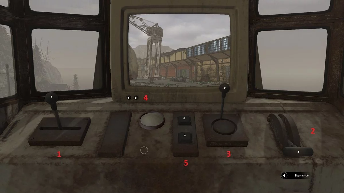 Осталось последнее — погрузить уголь на корабль. Залезаем на подъемный кран, использовав тот же код, что и для ангара. Код для подъемного крана: «0509». Там нас ждет довольно интересная панель управления (см. скриншот). Рычаг «2» меняет направление движения крана: в верхнем положении кран движется параллельно кораблю, а в нижнем — перпендикулярно. При помощи рычага «1» происходит движение в одном из двух направлений, определяемых положением рычага «2». Рычаг «3» позволяет вращать кран относительно своей оси. Кнопки «4» переключают камеры нашего обзора, чтобы мы могли точно определить местоположение крана. Наконец, кнопки «5» опускают/поднимают сам подъемный механизм.