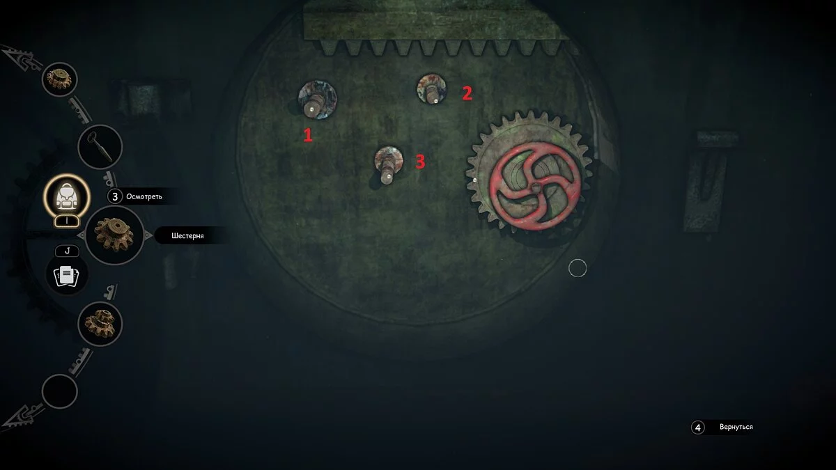 Спустившись под воду, Кейт предстоит открыть два замка. Они имеют одинаковый механизм. Первый затвор на пути выглядит совсем разобранным, и на данном этапе нам нужно просто собрать все валяющиеся детали: 3 шестеренки и квадратный ключ. Теперь топаем дальше ко второму замку (второй скриншот ниже). Используем квадратный ключ на отверстии под вентилем и открываем крышку, чтобы увидеть внутренности механизма. Поворачиваем вентиль влево и опускаем рычаг. Одна створка медленно отползает в сторону, а мы возвращаемся к первому затвору (первый скриншот ниже). На вал под номером «1» вставляем большую шестерню, на «2» — обычную шестеренку, а на «3» одеваем оставшуюся ступенчатую деталь. Крутим вентиль до упора вправо и используем рычаг. Возможно это баг, но именно так этот квест был засчитан игрой в моем случае, но доподлинно известно, что есть и нормальный вариант прохождения (найти цепь в обломках разрушенного корабля и добавить ее к остальным деталям в первом затворе). Загадка с шестеренками решена.