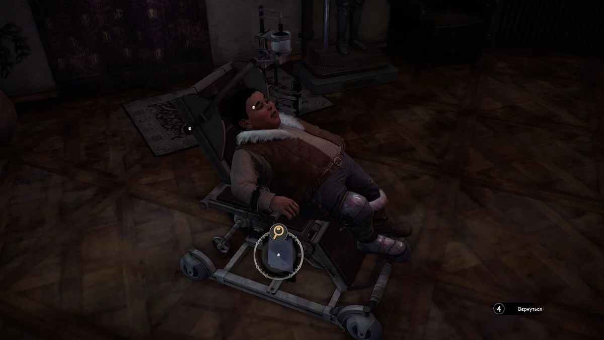 Возвращаемся в нашу палату и беседуем с Курком. Показав ему брошюру из кабинета Мангелинга, мы выясняем, что кузнец его племени без труда сделает такую деталь, а передать ему чертеж можно через сову. Ее прекрасно видно с балкона, она сидит на соседней крыше, но никак не реагирует на нас. Надо что-то придумать. Слева от кабинета врача находится местная столовая, где двое пациентов играют в шахматы. После беседы с ними мы узнаем, что на одного из них так «хорошо» действует новая схема лечения, что тот засыпает прямо на ходу. Выйдя в коридор и подождав немного, мы находим одного из шахматистов в центре холла, который жалуется на своего приятеля, мол опять заснул во время игры. Нельзя упускать такую возможность, идем к соне и забираем с его шеи ключ. Теперь можно попасть в комнату с птицами-аниматронами (ключ у нас есть) и забрать с собой одну из них. Это и будет наша приманка для совы. Ставим железную птицу на поручень балкона в нашей палате и отдаем сове брошюру со схемой ключа. Вернувшись в палату нас ждет встреча с мадам Ольгой.