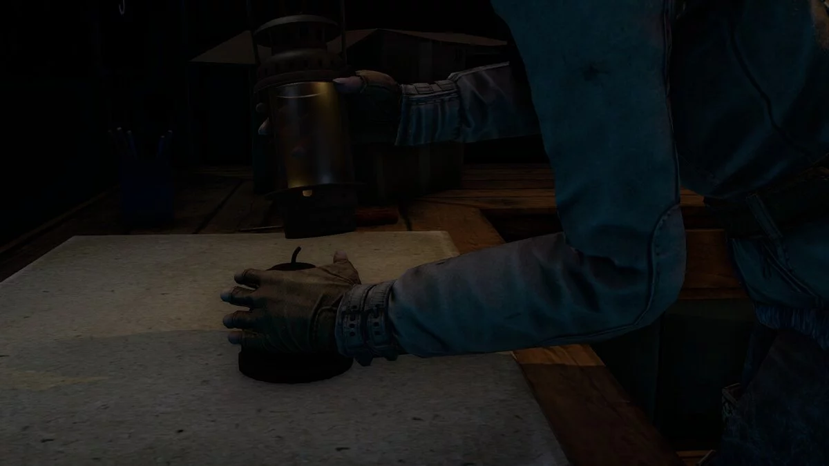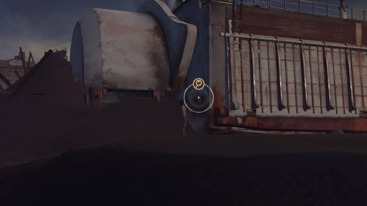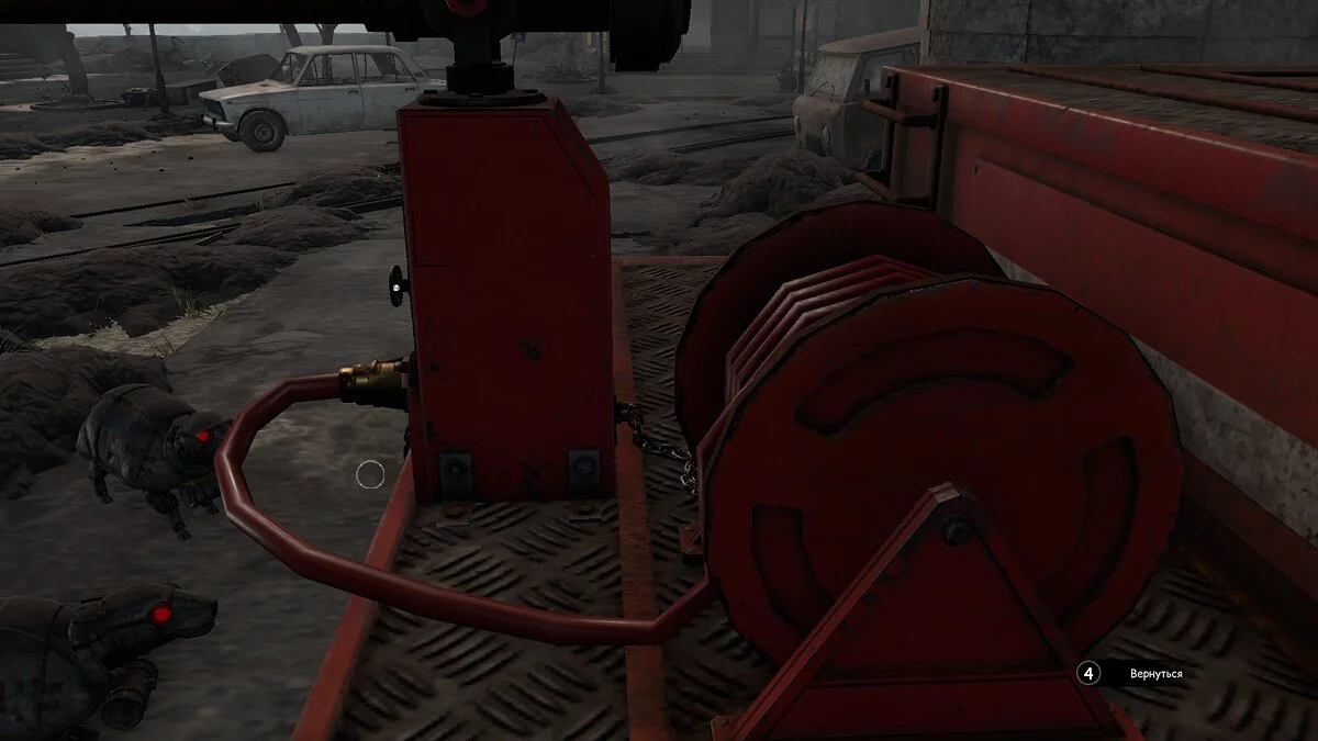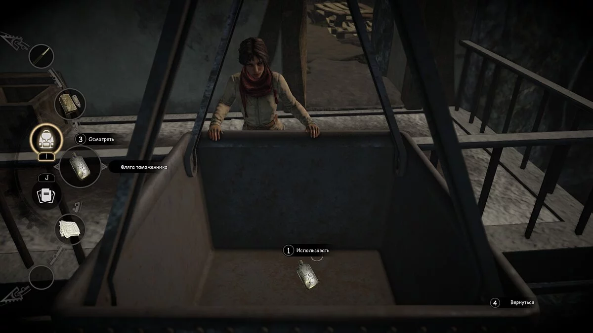 Сейчас спускаемся на сушу и идем в ангар. Он расположен прямо напротив трапа, рядом с подъемным краном. Чтобы туда попасть, нужно ввести код, который дал нам капитан. Код этот «0509». Внутри сразу берем желоб и арматуру, лежат они рядом с рычагом смены путей. Сам рычаг задействуем позднее. Теперь хватаемся за тележку и катим ее в другой конец ангара. По бокам от нас будут стойки со створками. Вот на них мы и будем применять наш желоб. Делать это предстоит до тех пор, пока мы не найдем наш уголь, так как будет он не везде. Арматуру же можно использовать для того, чтобы определить, есть ли что-то в стойке или нет. Кейт просто бьет арматурой по коробу, а мы по звуку должны понять, наш ли это «клиент», или можно идти дальше.