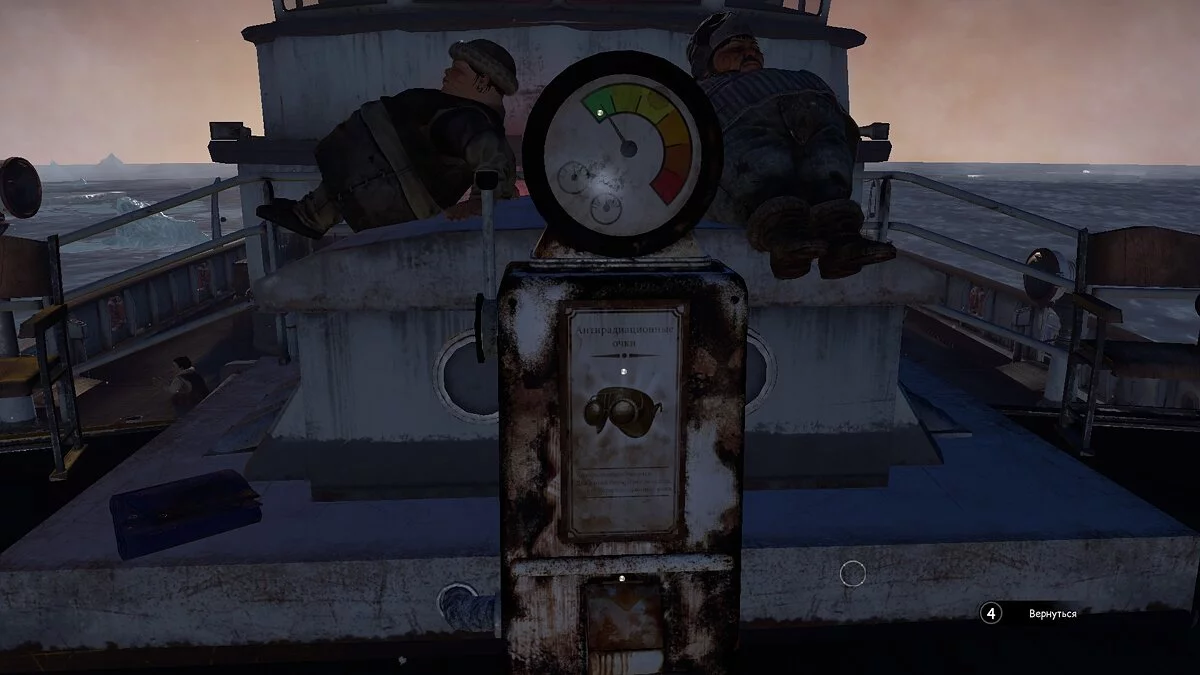 Пока Кейт была в отключке, корабль успел сесть на мель, и не в Находске, а в самом Барануре, куда мы так не хотели попасть. А тут же радиация кругом! Надо достать специальные антирадиационные очки из автомата, который стоит на носу «Кристалла». Правда он блокирован, но это легко поправить, вставив в него тот самый ключ зажигания, который Кейт, можно сказать, сделала своими руками. Найти этот ключик можно рядом с капитанским штурвалом. Надев очки, становится понятно, что пляж относительно чистый с точки зрения радиационного фона. Поэтому сходим на берег, нам ведь нужно корабль как-то вытащить на пляж, чтобы страусы смогли спокойно покинуть судовой трюм, иначе они просто утонут. Оглядевшись, можно увидеть специальный трактор, который сможет вытянуть «Кристалл» на берег, но до него еще нужно добраться. Еще тут же видим, что от трактора в нашу сторону идут кабеля, висящие на столбе рядом с юколом. Запомните их, нам нужно как-то их снять.