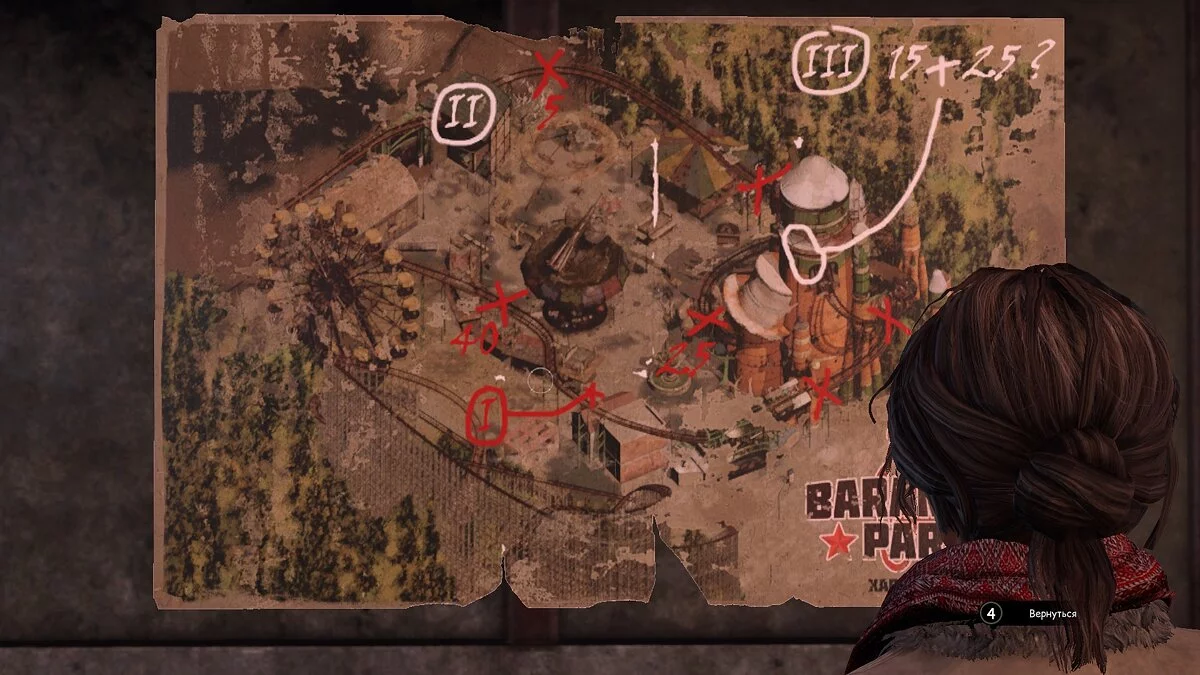 Теперь идем в то здание, над которым мы видели машинку. Это слева от входа в парк, если стоять к нему спиной. Поднимаемся на крышу этого домика и садимся в машинку на рельсах. Видим панель управления аттракционом перед собой, а справа на соседнем сидении нужно поднять второй железный прутик. Теперь, собственно, головоломка:
