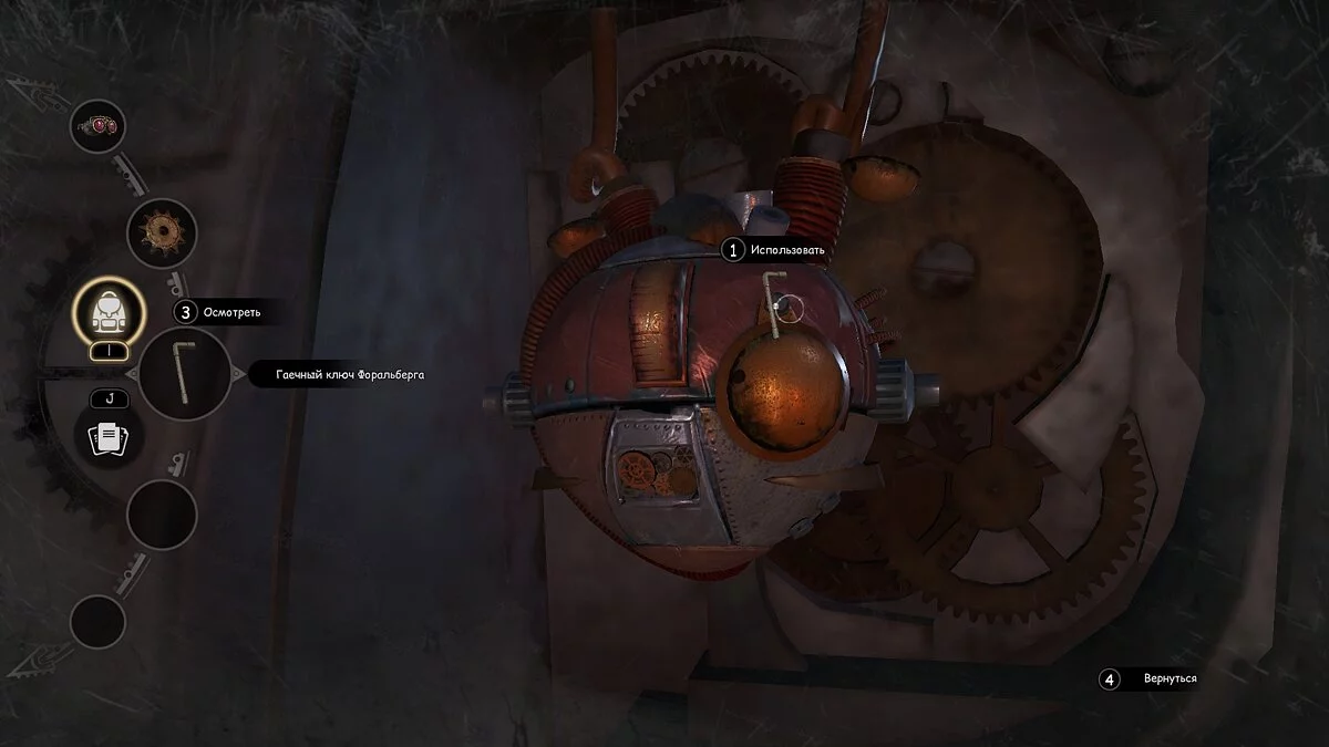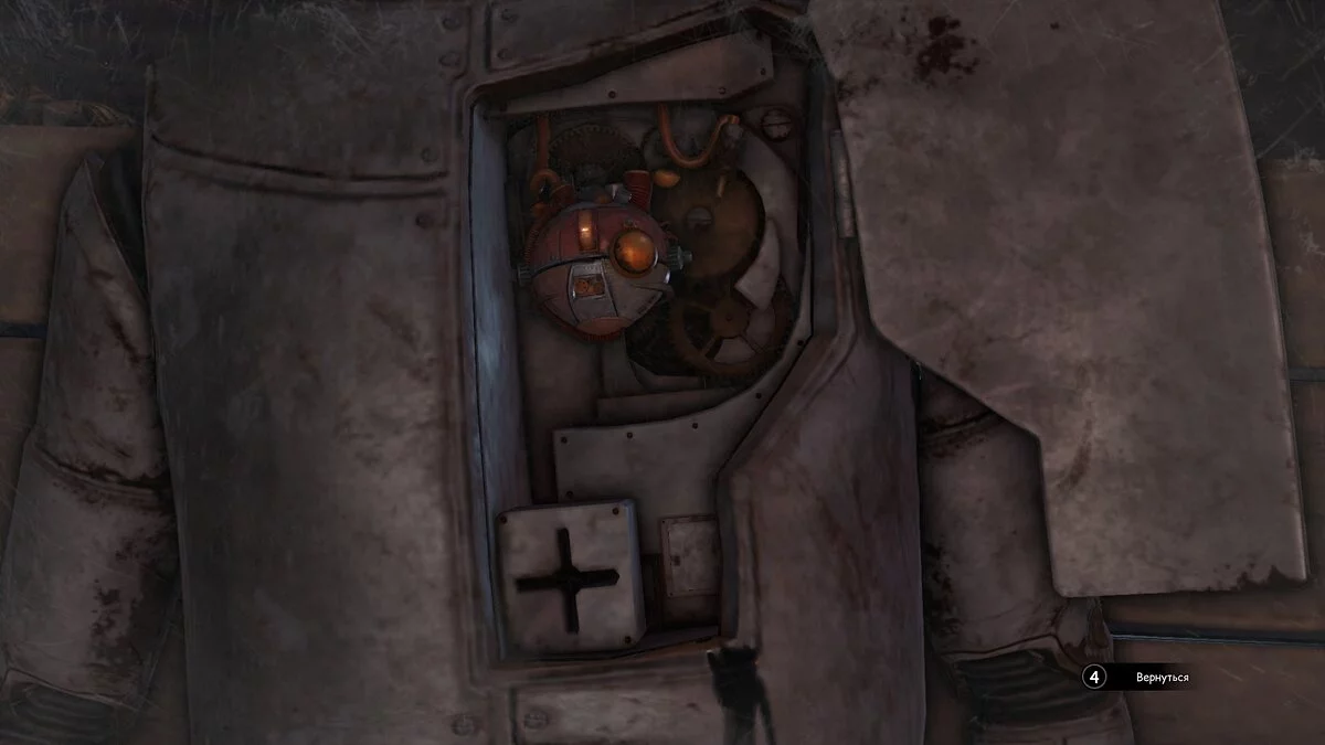 Юколы подбросили еще одну головную боль — вот идет их путь сквозь ядовитые пары и все. В конец своих задач припишем и эту цель. Давайте вернемся к тому автоматону, в которого мы хотели вставить сердце нашего друга. Теперь мы можем открыть грудную пластину. Внутри слегка бьется старое сердце, его вытаскиваем и вставляем наш «медальон». Поднимаем верхние клапаны и вставляем штекеры в них. При помощи гаечного ключа выкручиваем болтик и поднимаем блестящую крышку. А там еще один замок, и для него нужен еще более индивидуальный ключ Форальберга.