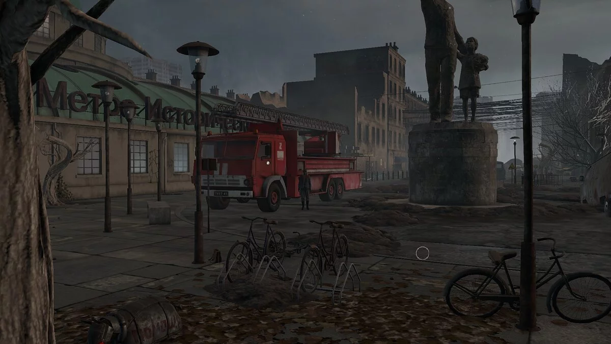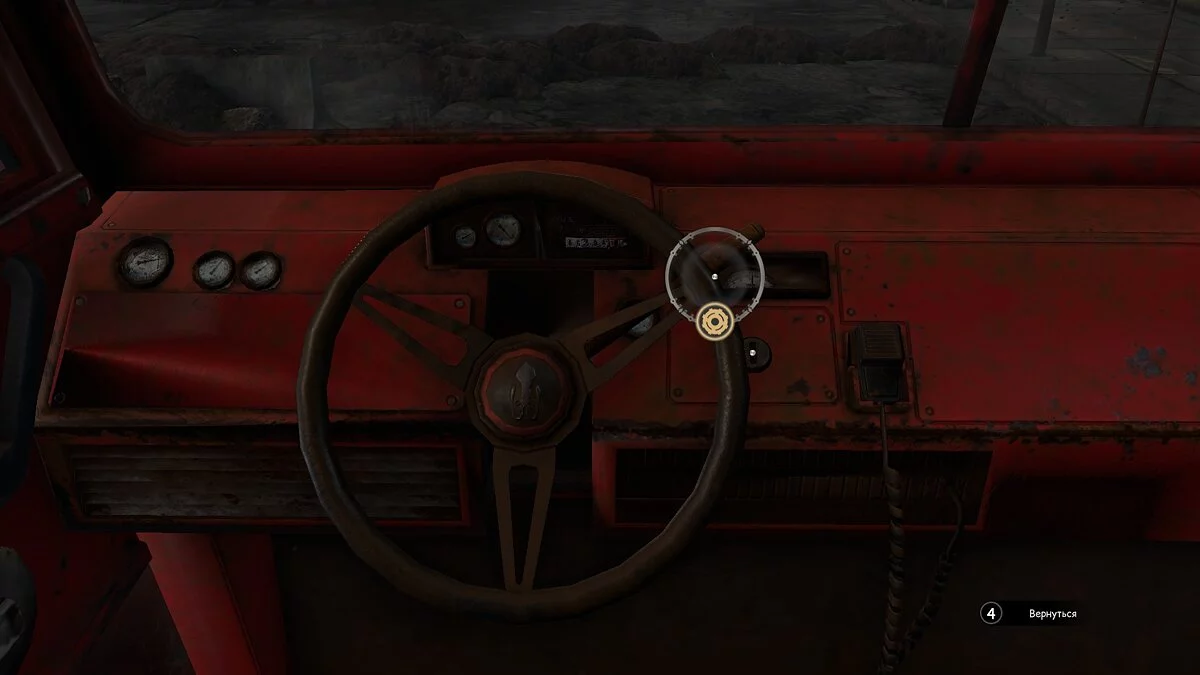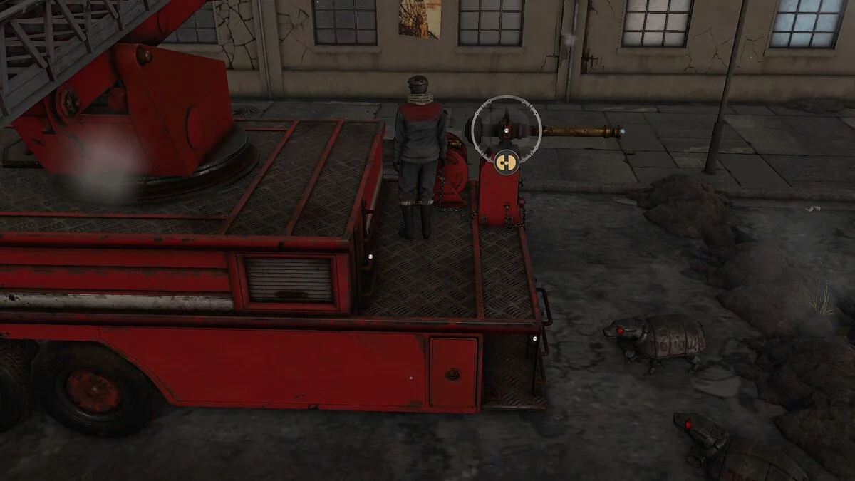 Выходим на улицу, осматриваем люк на крыше, который нам надо открыть, и идем в направлении памятника. Недалеко от него стоит пожарная машина. Садимся в нее и заводим при помощи ключа (ключ лежит в бардачке). Снимаем ручник и подъезжаем поближе к нужным нам люкам.