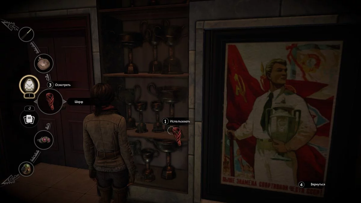 Вернемся чуть назад и поднимемся по эскалатору на второй этаж. Там предстоит найти комнату с трофеями. Осматриваем стекло и используем шарф, чтобы добраться до последней третьей линзы.