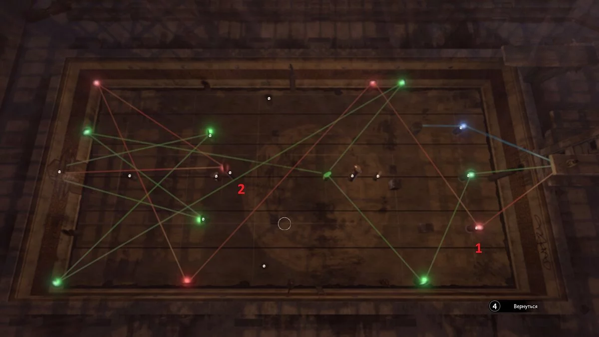 Начнем с зеленого луча. На картинках ниже помечены те зеркала, которые предстоит повернуть для каждого конкретного случая. Для синего луча просто оцените все оставшиеся неиспользованные зеркала и задействуйте их. В итоге стартовый синий луч должен разделиться на четыре отдельных лучика и осветить все камни нужного цвета.