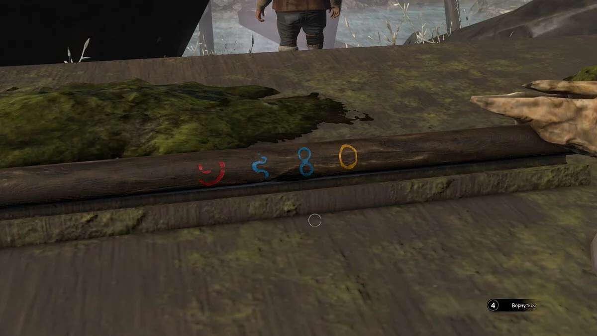В этих записях хранится история и описание юкольских знаков, это поможет в решении следующей головоломки. Возвращаемся к кладбищу, но заходим не в него, а на стадион. Теперь просто идем прямо, пока не наткнемся на одинокий стул. Открыв нижнюю часть, получаем кодовый замок из шести элементов. Он отделяет нас от второй линзы. Правильное решение на скриншоте ниже, а правильная последовательность знаков такова: