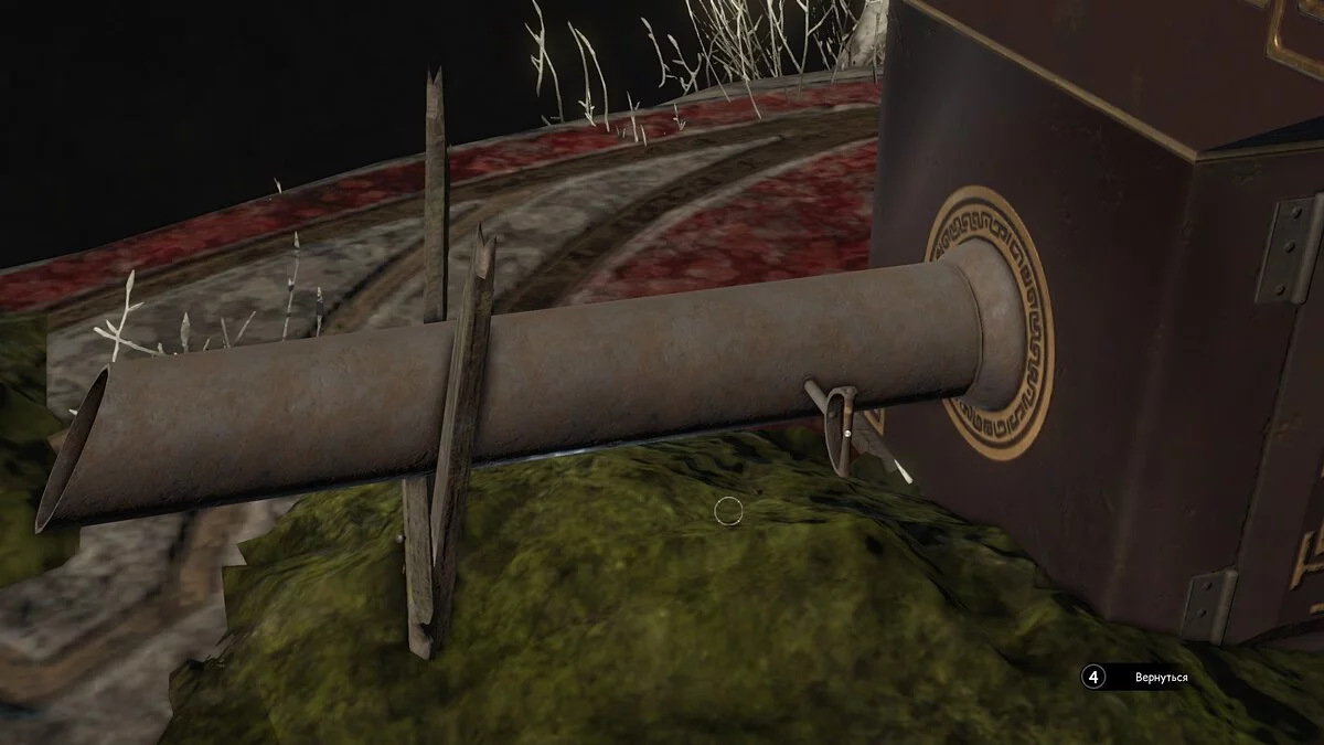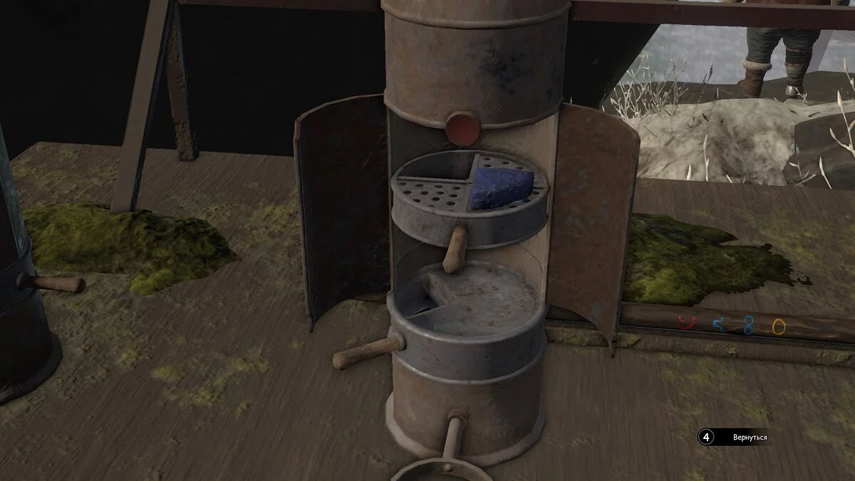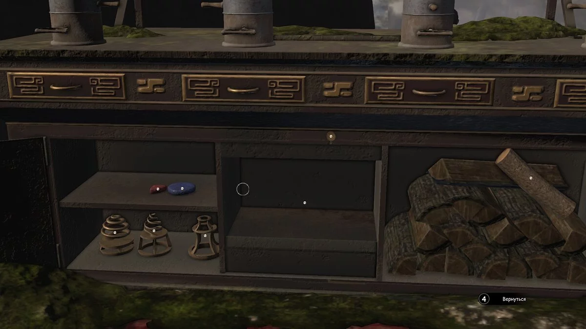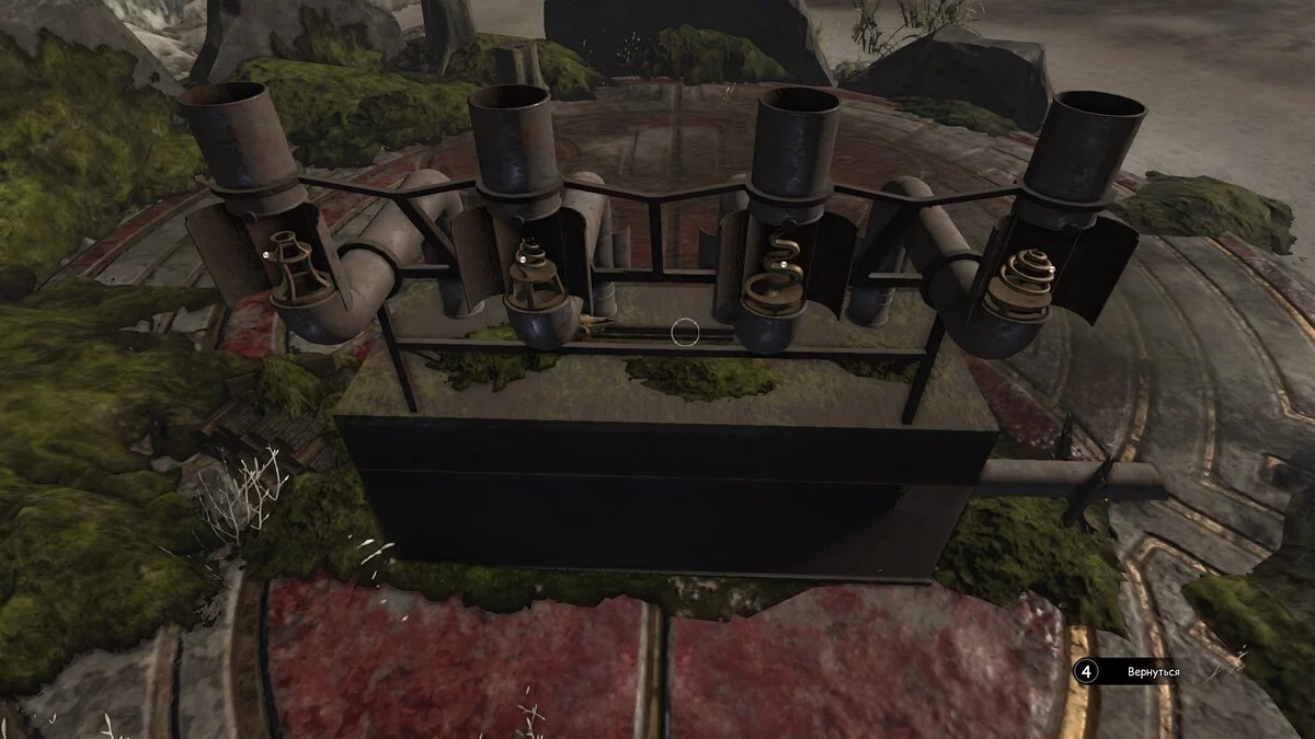 Осматриваем трубы — они также открываются, как и створки дымоходов. Забираем всю смолу и отходим от аппарата. Сзади нас стоит пенек, кладем на него полукруг синей смолы и при помощи ножа вырезаем четвертинку. Возвращаемся к трубам, которые только что открыли. Тут все несколько сложнее. В каждой трубе есть специальная сетка, одна четвертинка которой пуста. Под этой сеткой расположен специальный блок с такой же пустой четвертинкой. Надо сделать так, чтобы пустой слот снизу не находился под пустым слотом на сетке. Если такое случилось, то поднимаем сетку до упора вверх, крутим нижнюю часть, чтобы сменить положение дырки и опускаем сетку обратно.