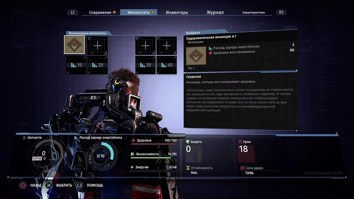 Например, у вас есть три одинаковых импланта. У всех у них по 3 заряда одно и то же действие — восстановление определенного количества здоровья. Если экипировать всех три, то суммарное количество зарядов станет равно 9.