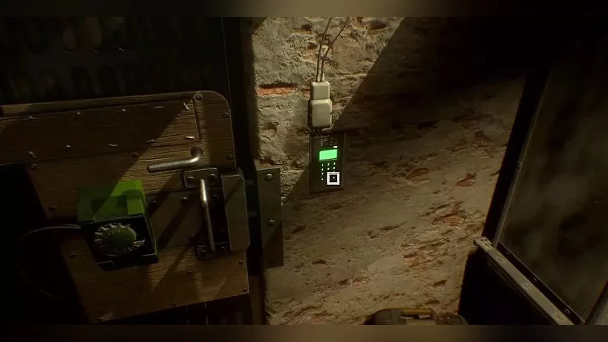 Эта дверь в подвале имеет яркий знак выхода. При взломе вы узнаете лишь три числа — 400. Но путем простого подбора чисел правильный код найти несложно. Вот он — 4004.
