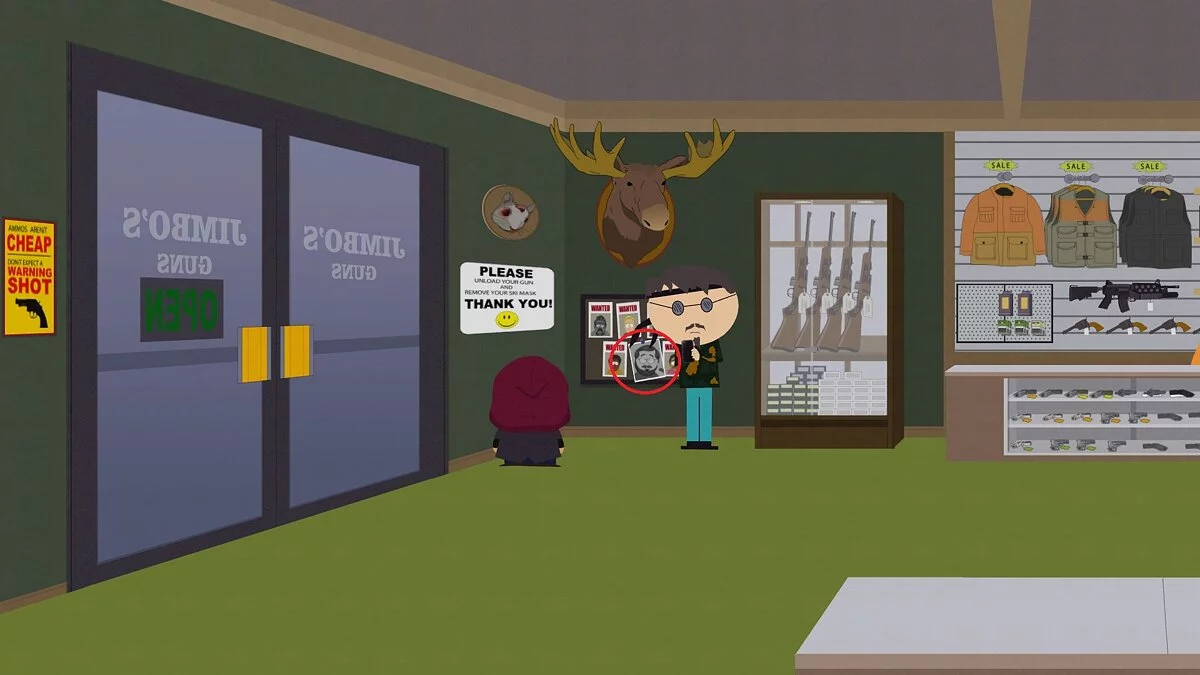 Оружейный магазин Джимбо — Доска с объявлениями «Разыскиваются» рядом с Недом.