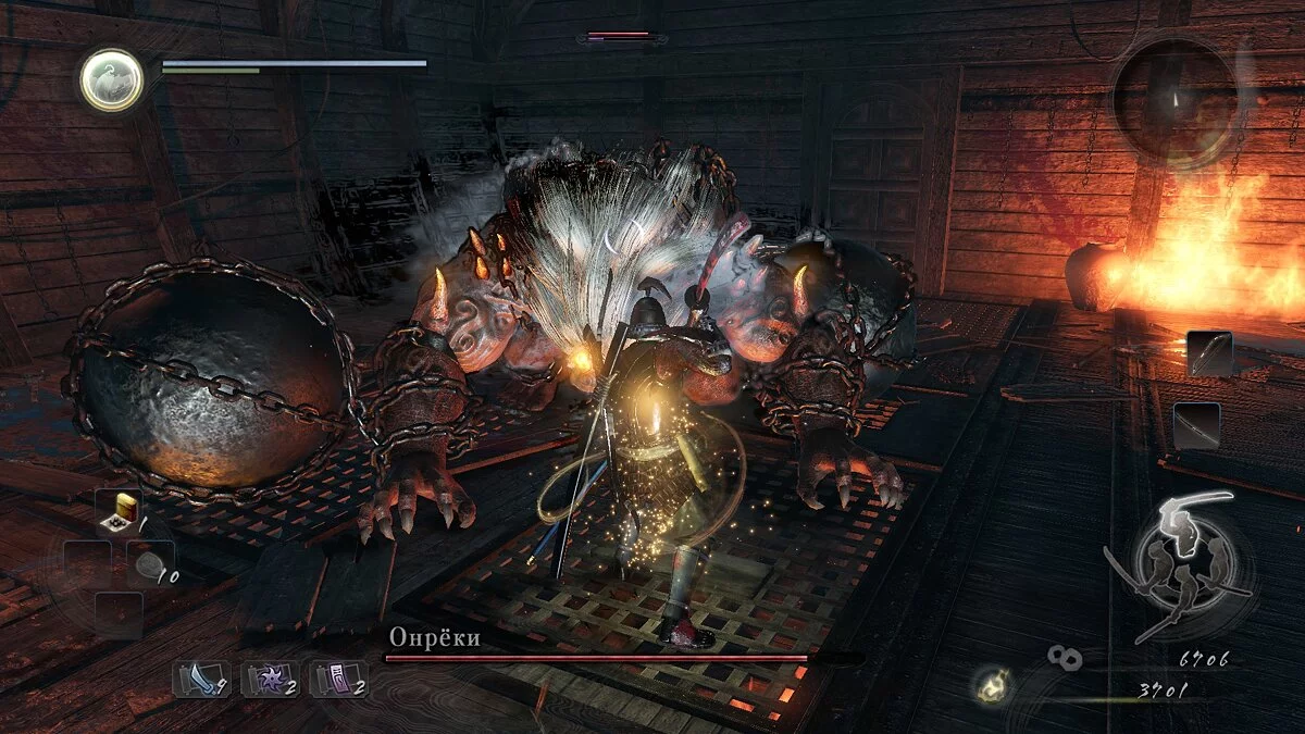 Бой с Онрёки — это проверка на умение уворачиваться и балансировать между обороной и нападением. Основная тактика такая: подойти с фланга и ждать, пока босс начнет размахивать шарами по сторонам. После этой атаки один из шаров врежется в пол, и боссу потребуется некоторое время, чтобы совладать с ним.