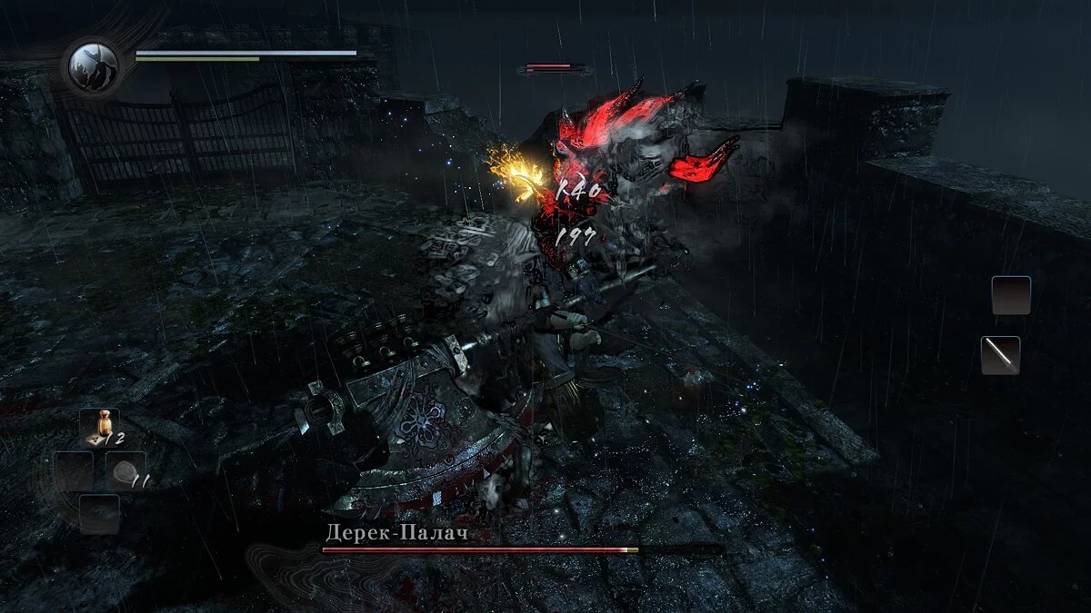 В этот момент нужно бить. Но при этом нельзя спускать глаз со второго шара, которым Онрёки может попытаться помешать главному герою. После того, как босс начнет приходить в себя, нужно немного отойти, чтобы не попасть под шквал ударов. Повторить.